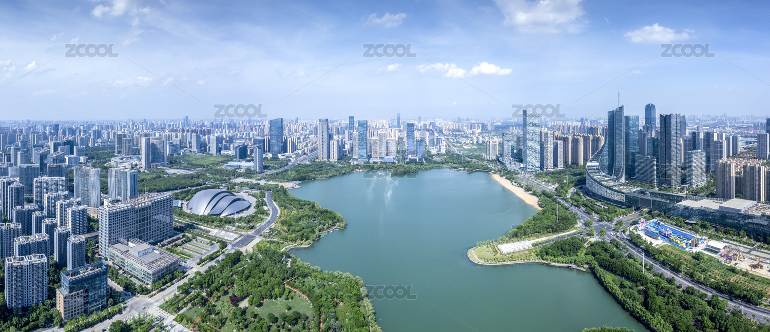 中国安徽省合肥市天鹅湖城市风光——政务区航拍