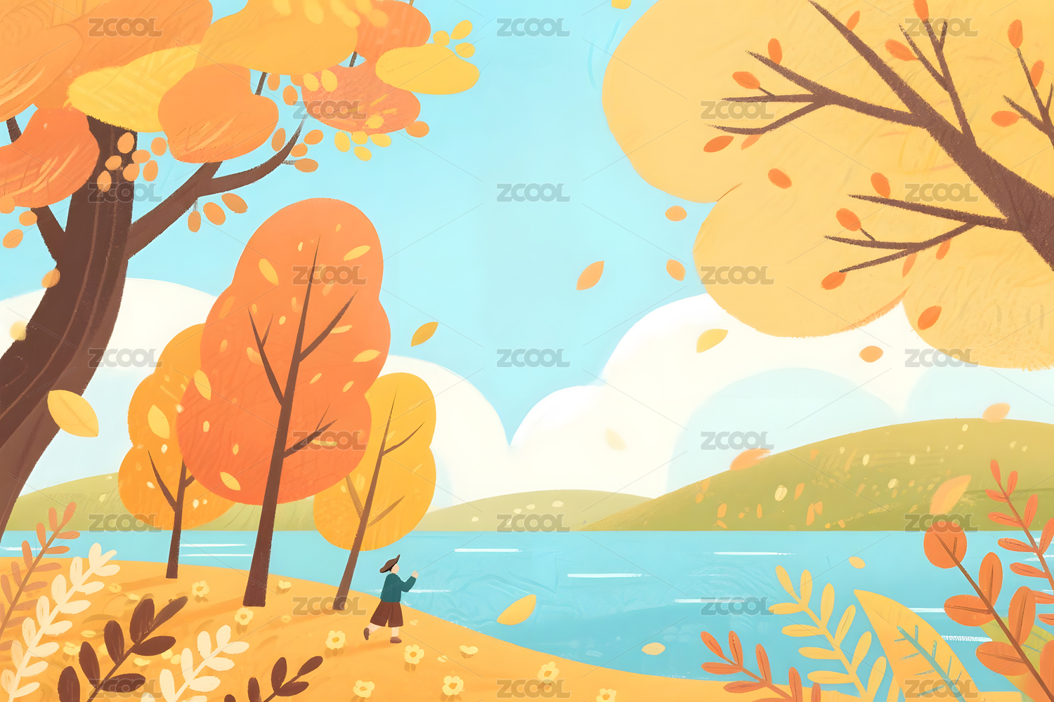 秋天秋季户外自然风光风景卡通漫画插画