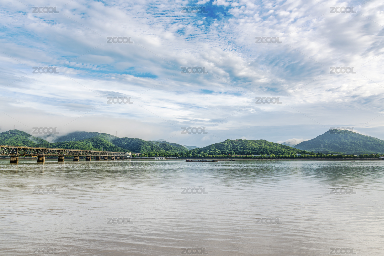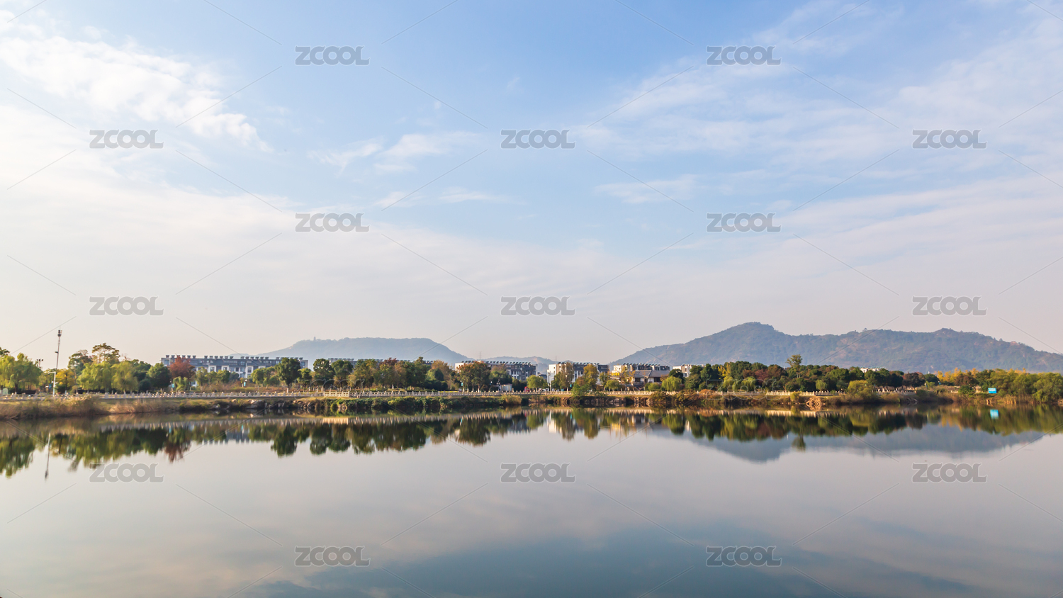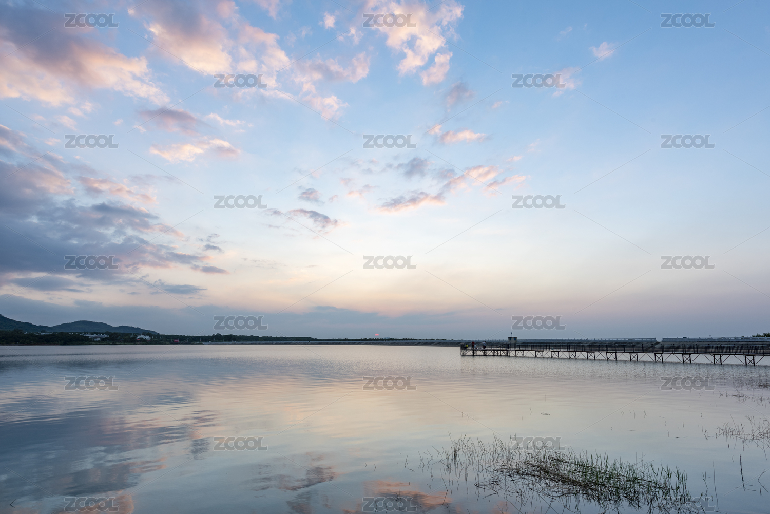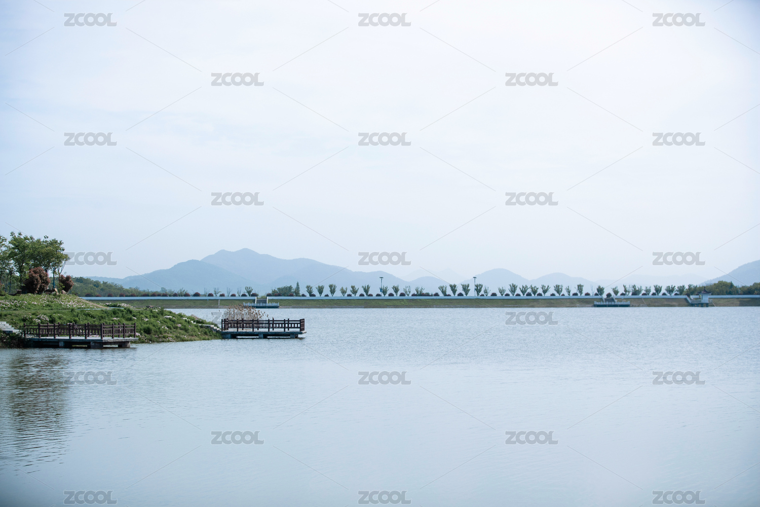 南京远处有山和观景台天际线平直堤坝的湖泊