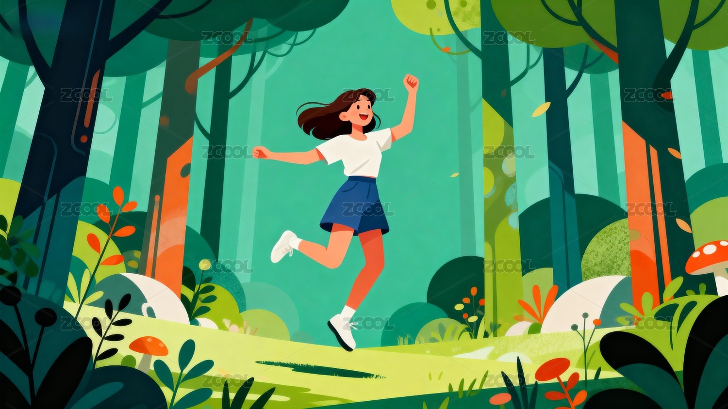 森林里快乐飞跃的女孩