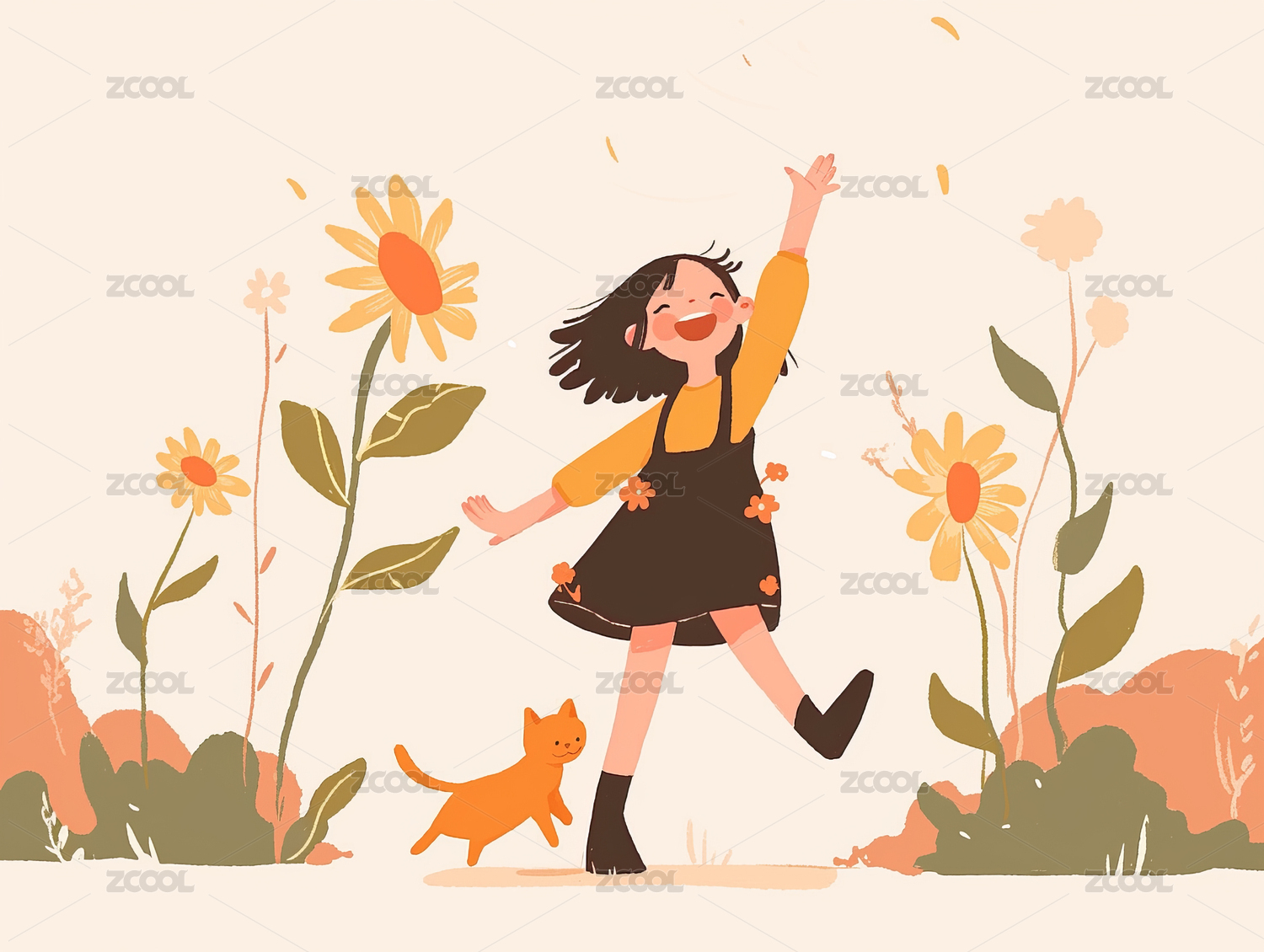 女生在花园中跳舞手绘插画