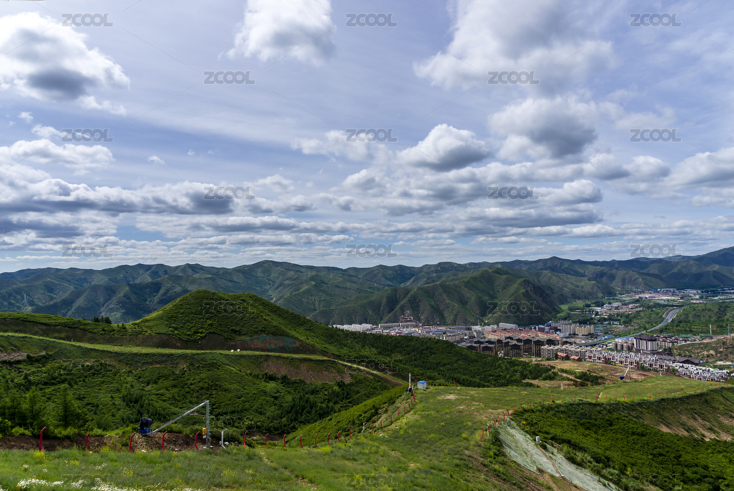 河北崇礼蓝天白云天空下夏季绿色山峰风光