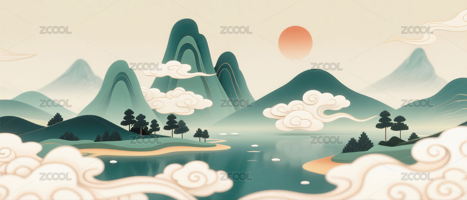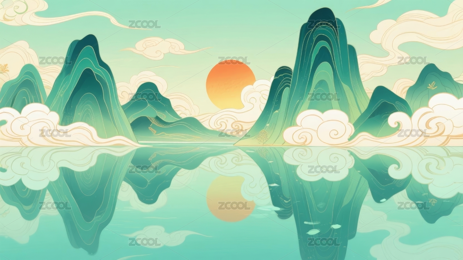 新国风古风国潮青绿山水画水墨传统背景壁纸