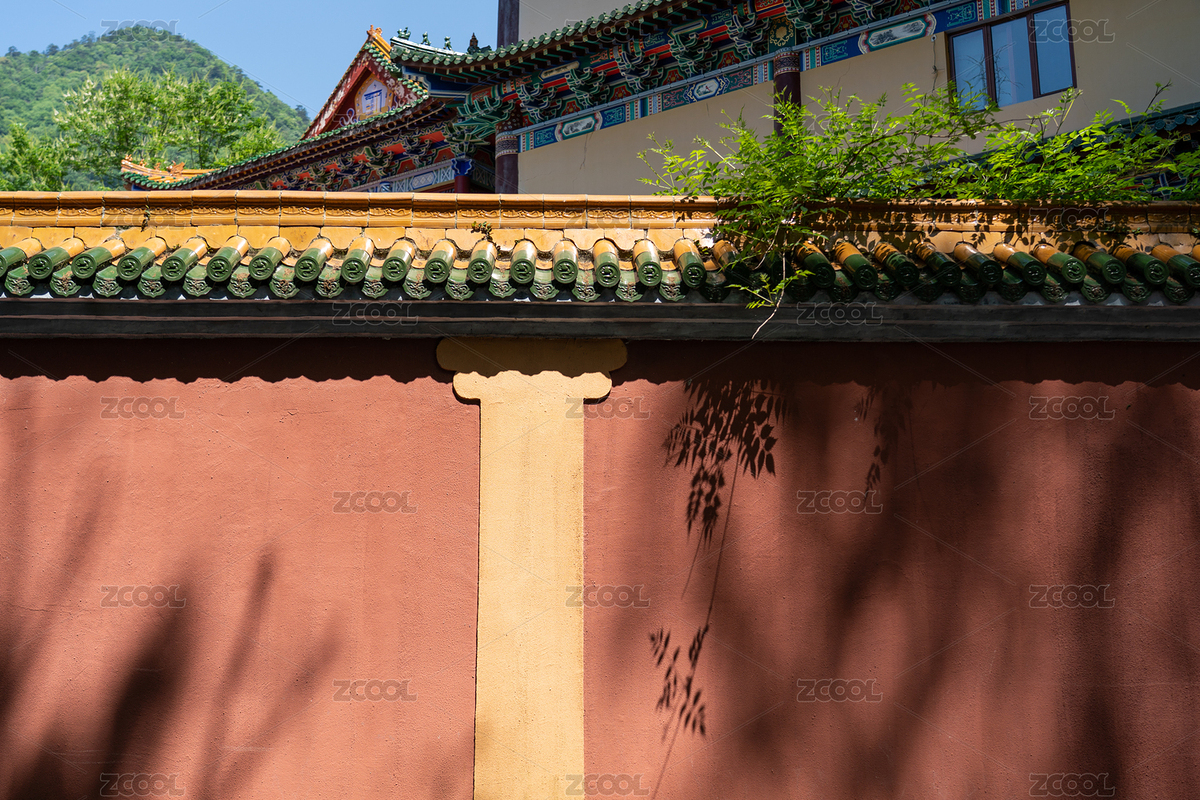 初冬的阳光把树影映在昆明黑龙潭公园的古典建筑墙壁上