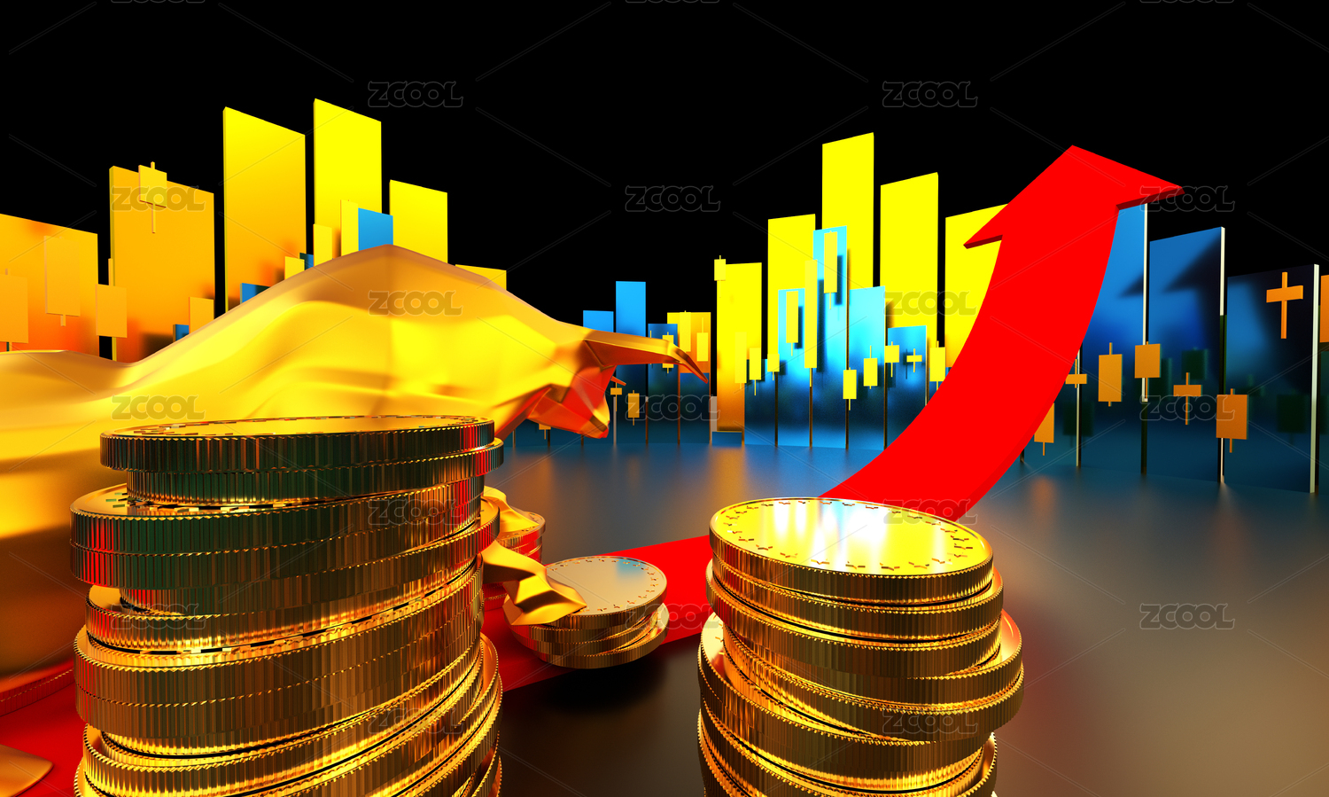金牛与成功箭头,牛市经济与事业的发展成功