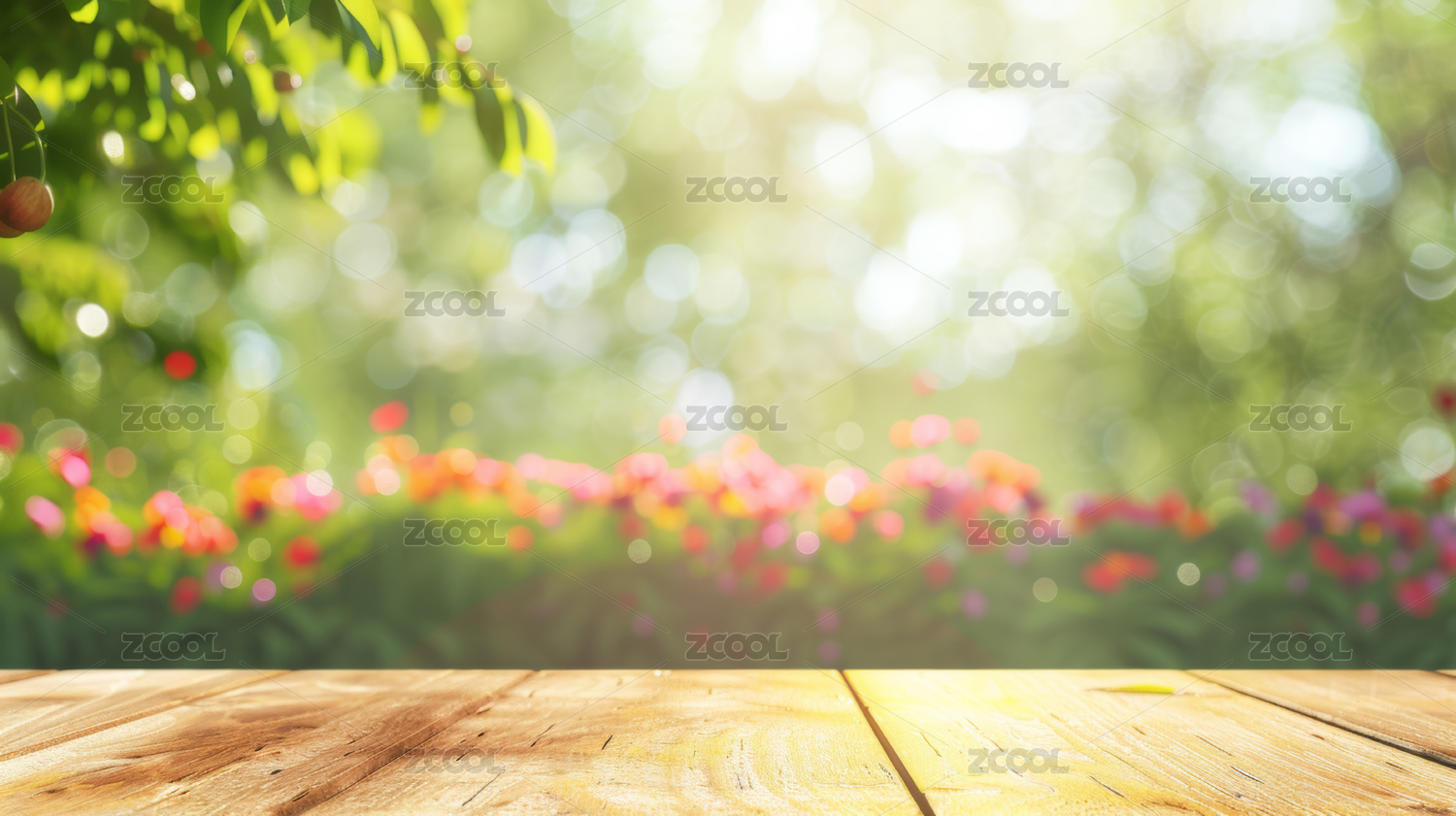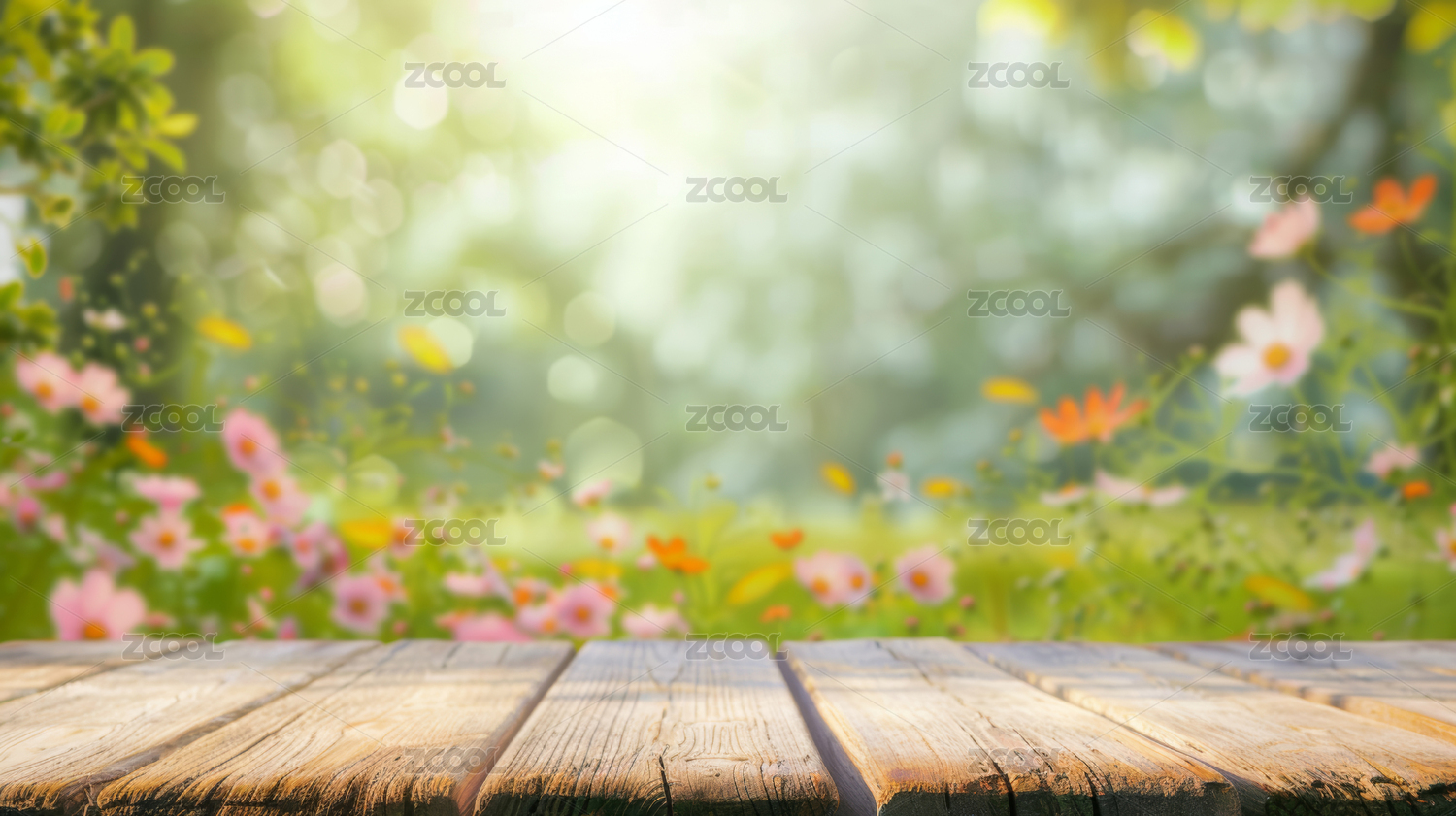 空的木质桌面,模糊虚化的绿色植物背景