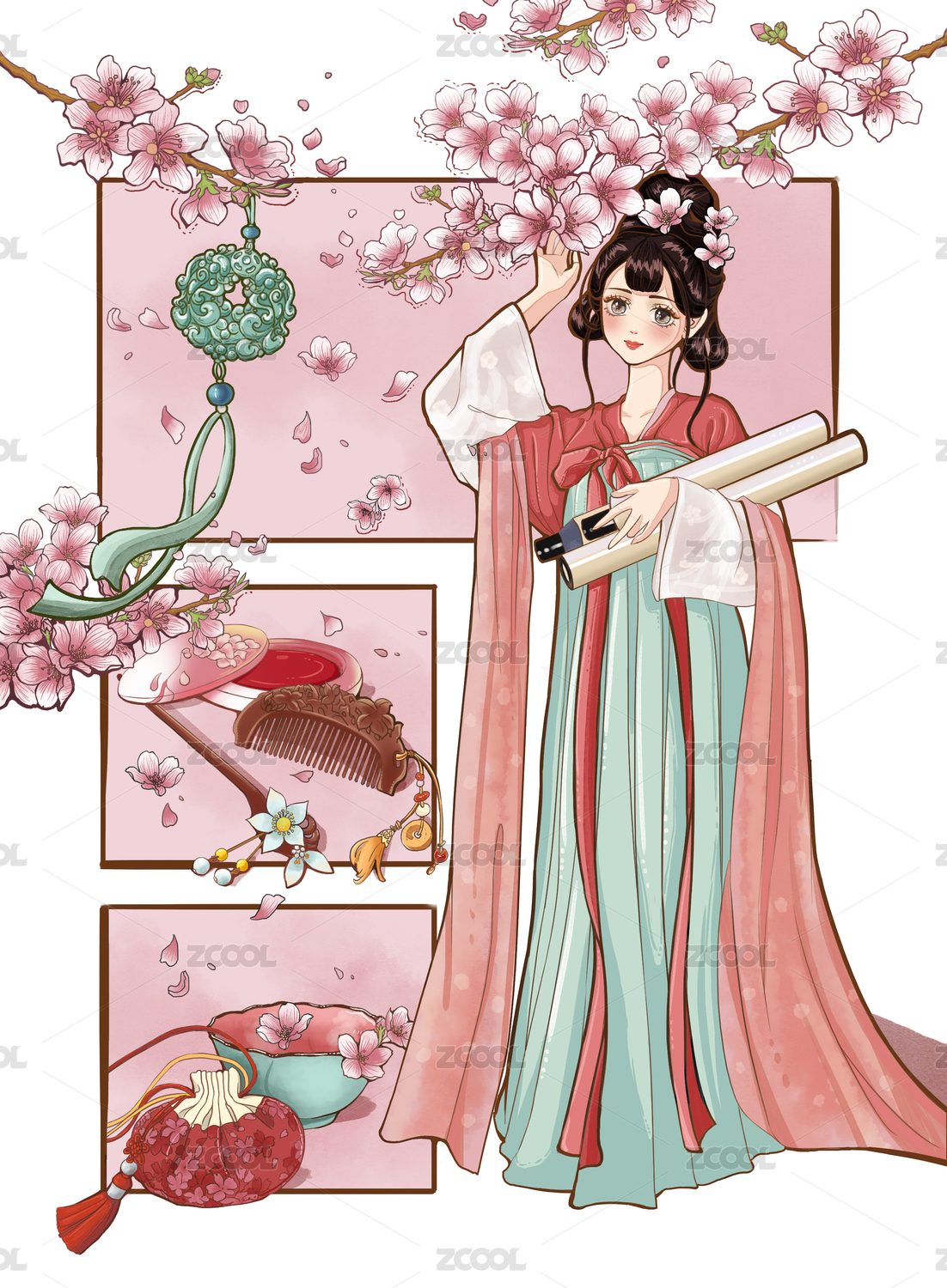 复古喜庆中国风古代仕女手拿迎春花装饰海报