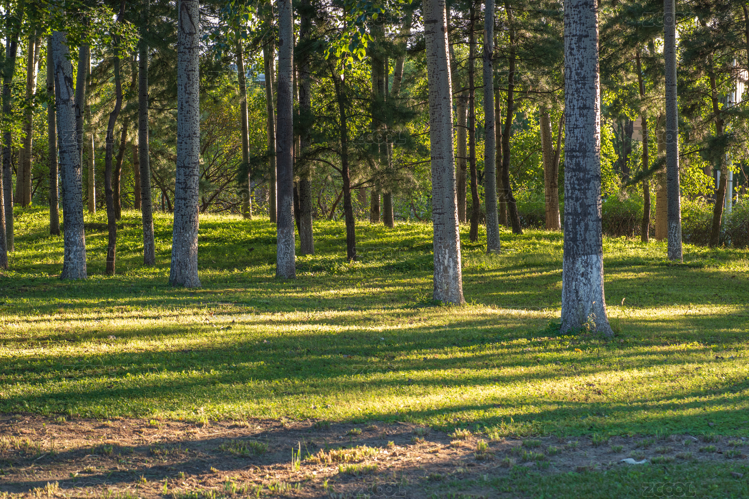 夏季阳光下的杨树林青草地