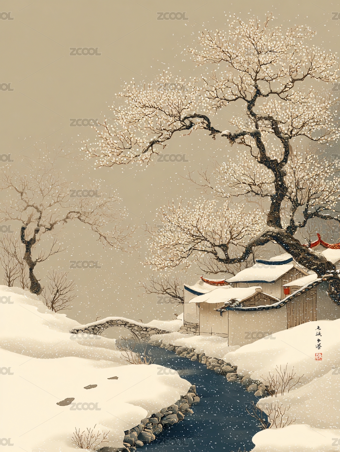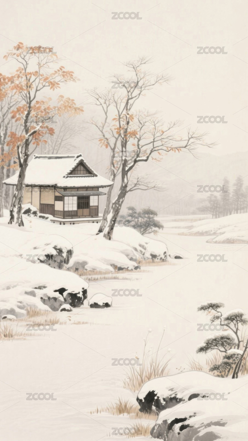 水墨雪景中的诗意栖居水墨雪景中的禅意小屋