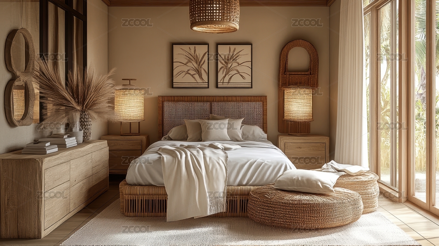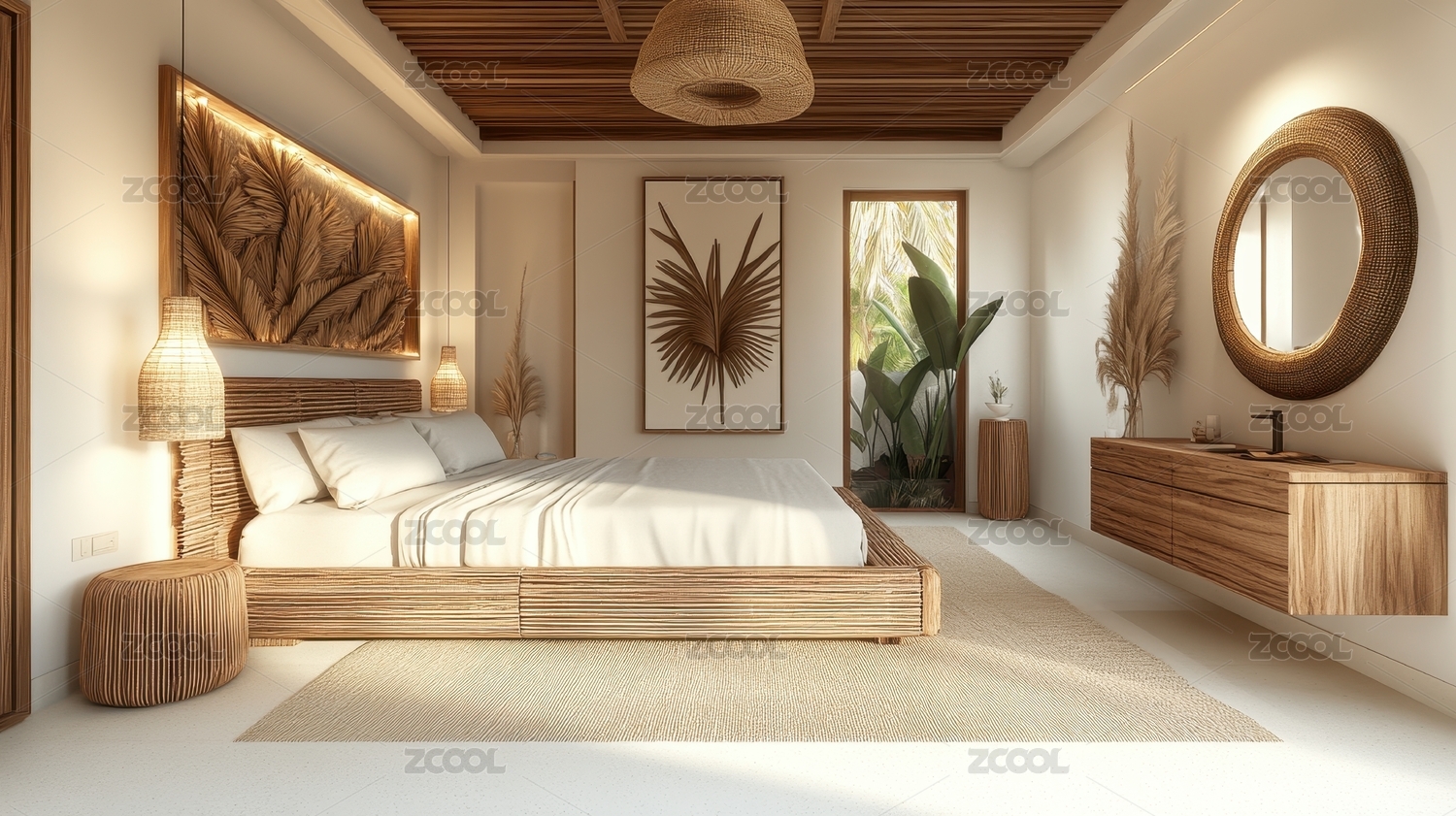 卧室,设计,极简,简约,木质,床,装饰画,藤编,地毯,温馨