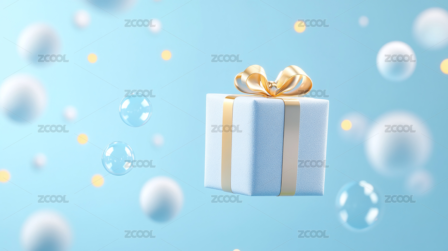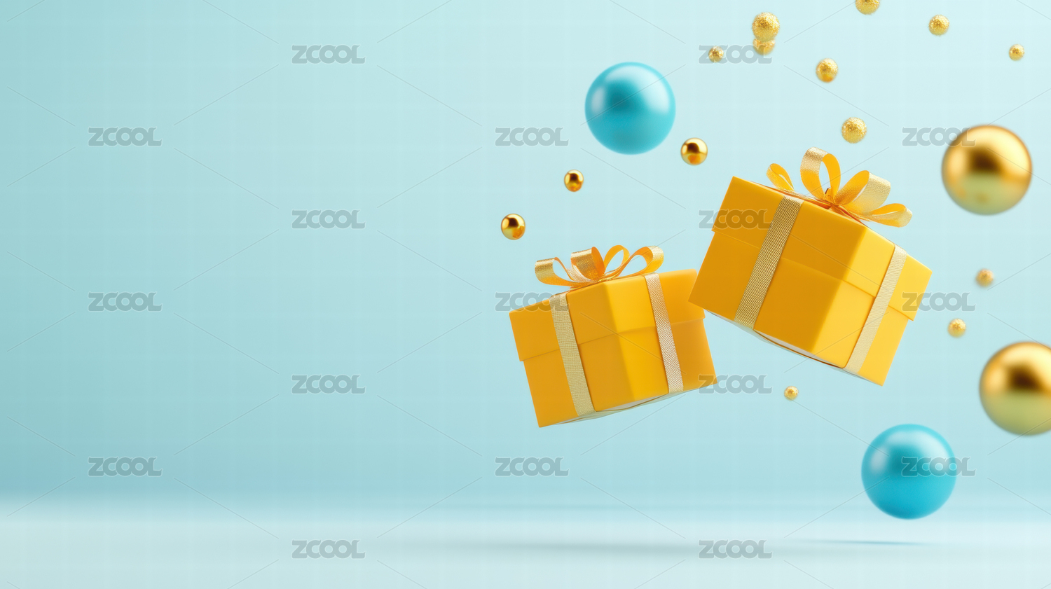 悬浮的金色礼盒和彩色球体