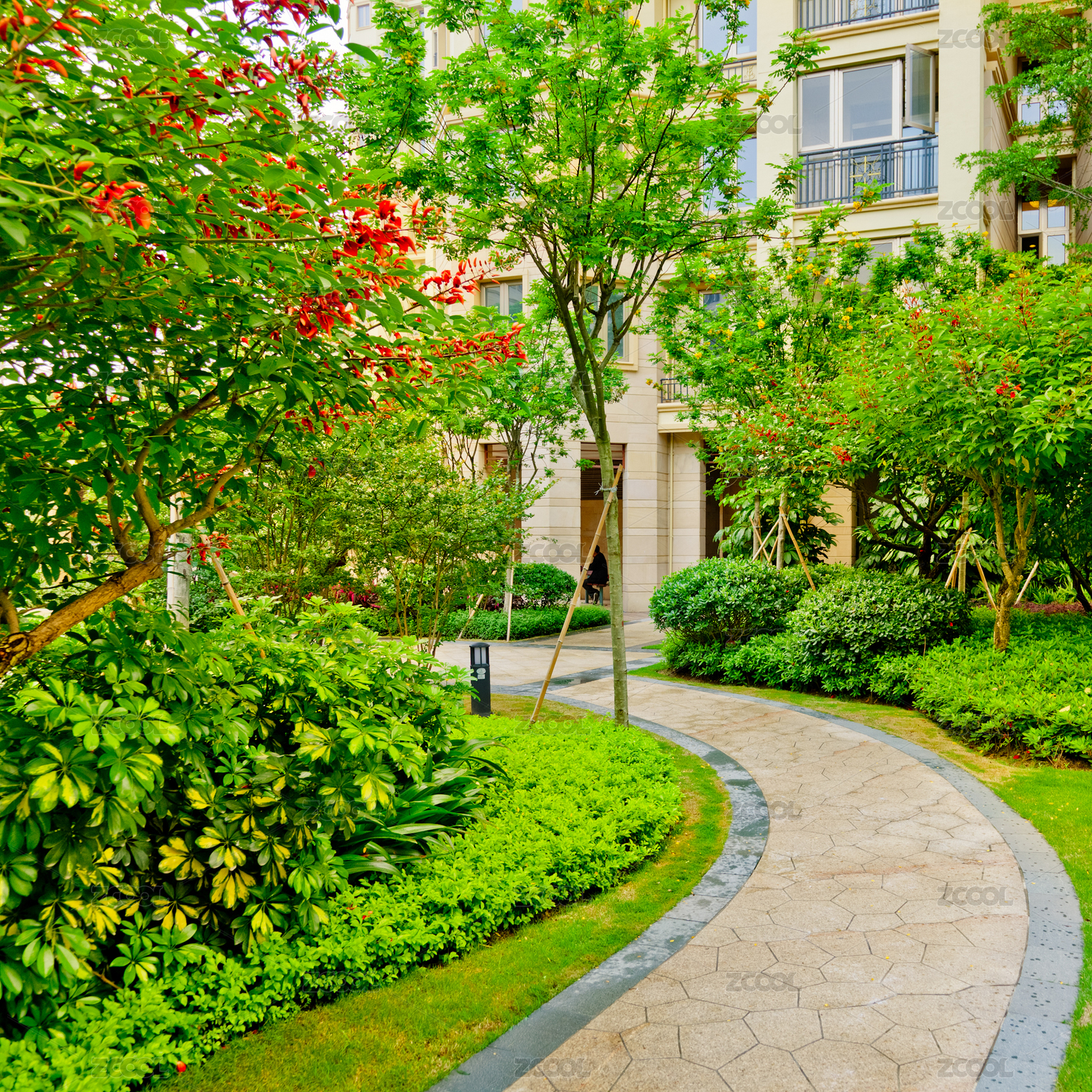 绿色草坪,花园景观,绿草园和花园的曲线人行道