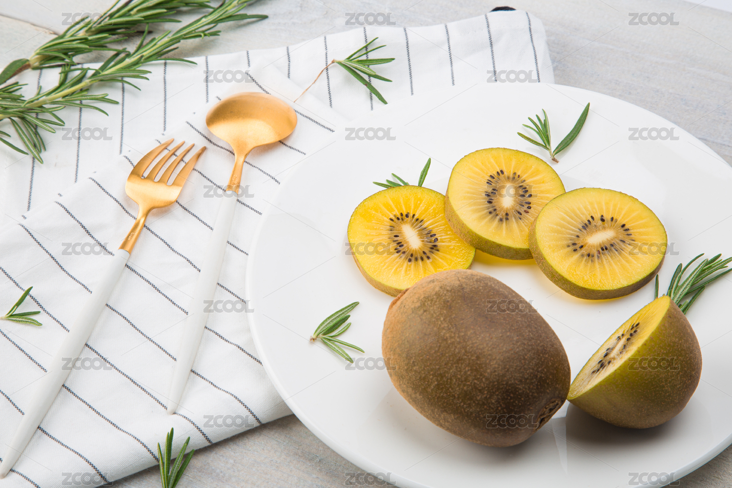 白色桌面碟子中的切开的新鲜水果猕猴桃果肉