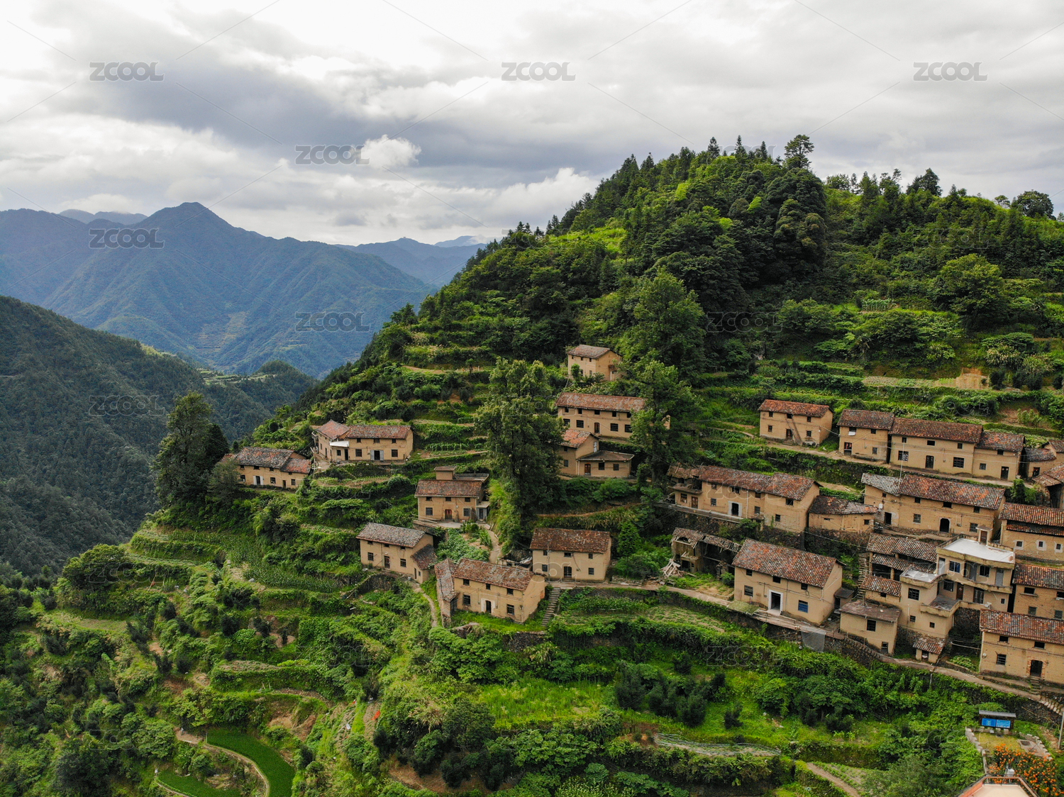 中国安徽省的大洲源景区的高山峡谷和美丽村