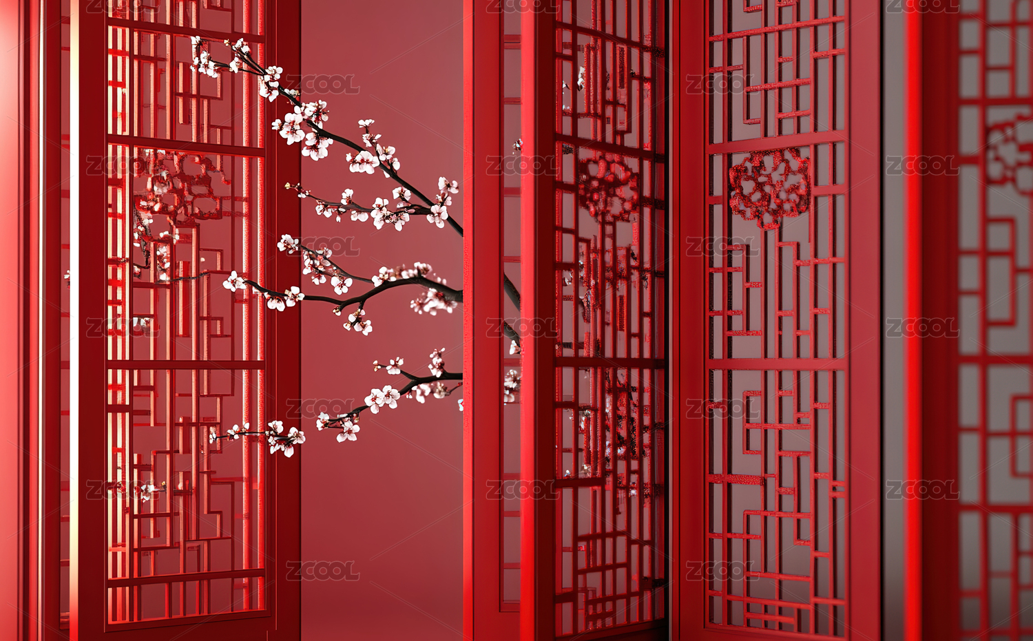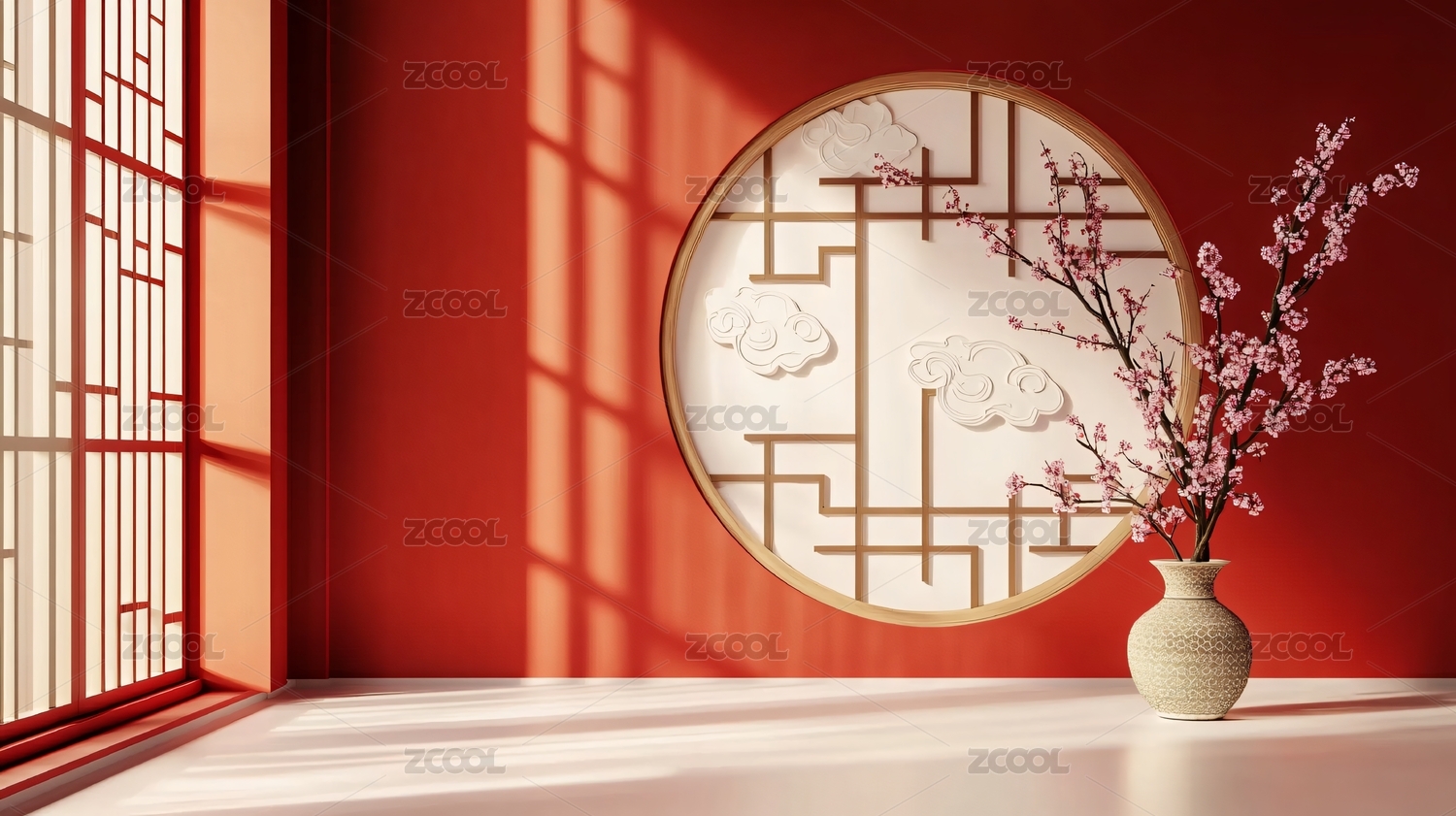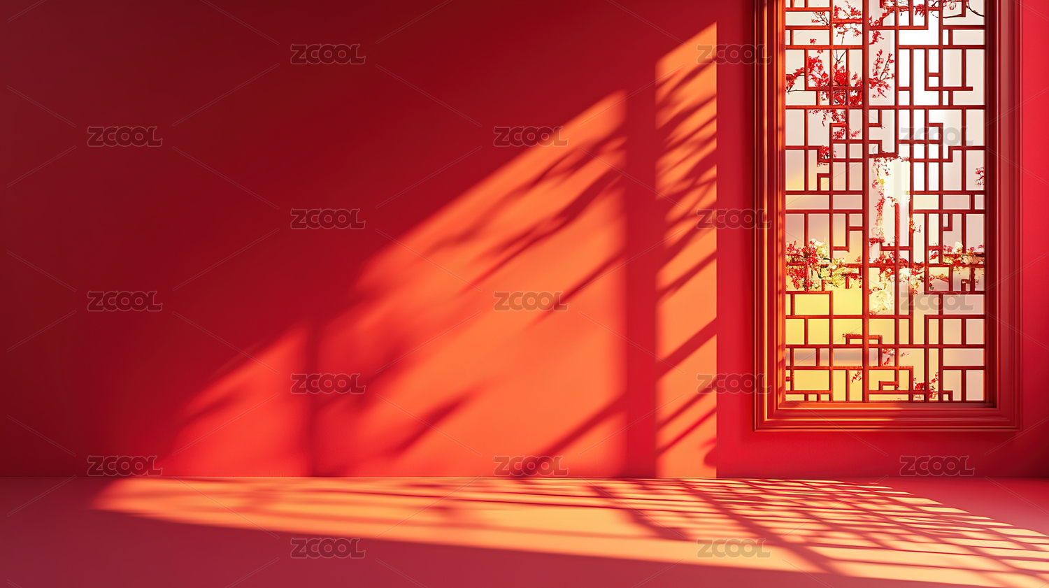 红色背景中国风室内装饰,光影婆娑