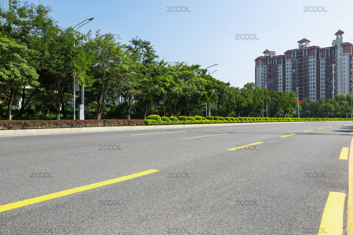 现代城市里空荡荡的马路斑马线和摩天大楼
