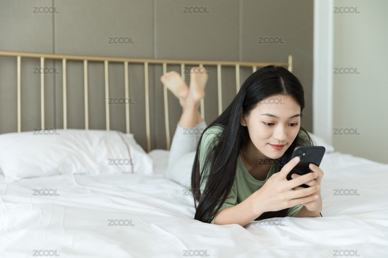 一名年轻的亚洲女子趴在床上使用电脑和手机