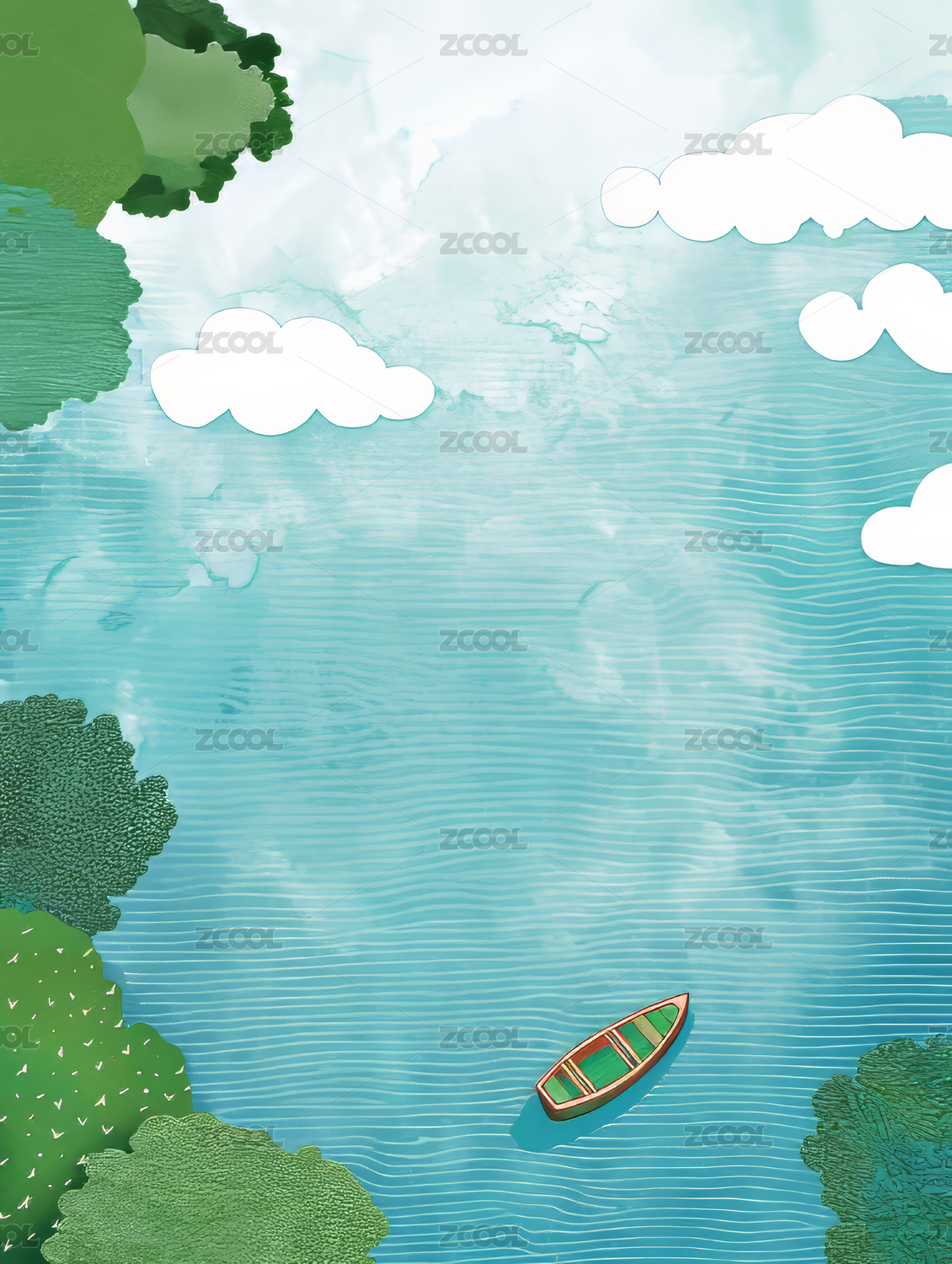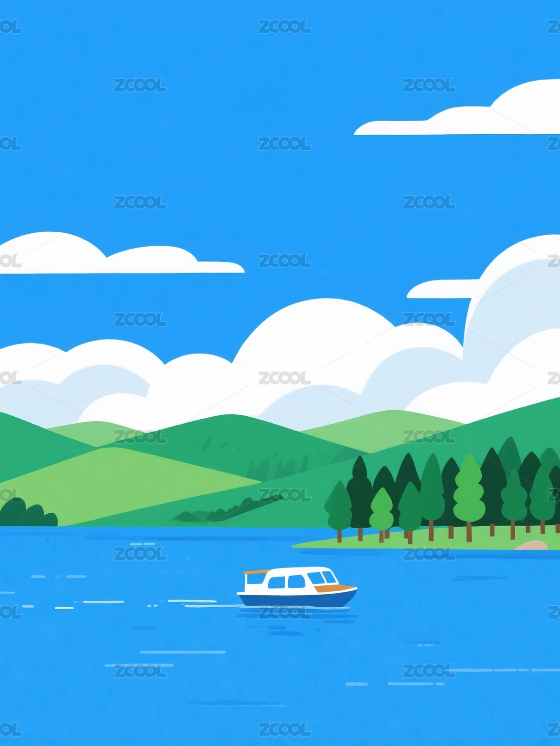 湖泊蓝天白云游船绿树山丘