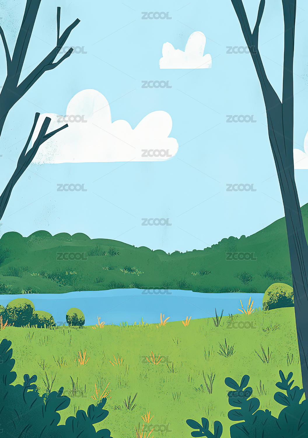 湖面环山白云风景清新公园插画