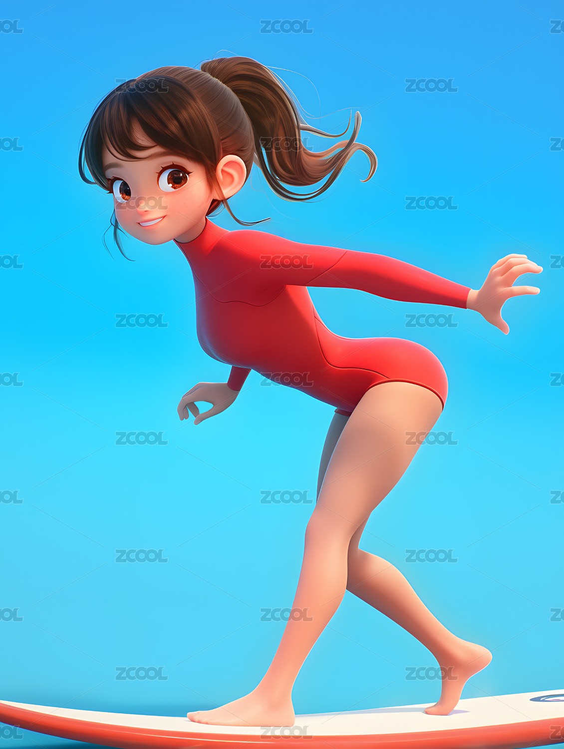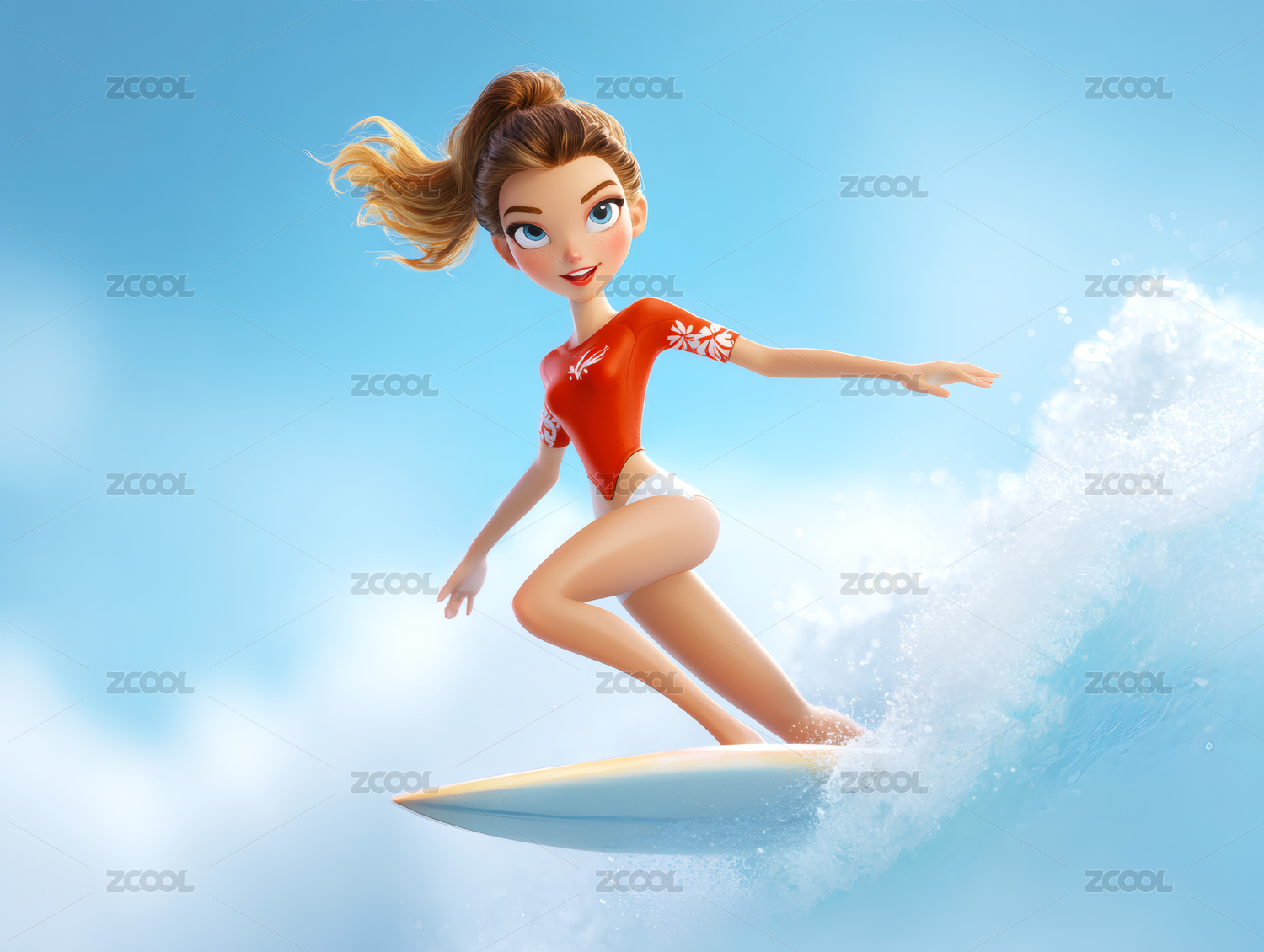 夏季多巴胺配色3D卡通的美女在海边嬉水