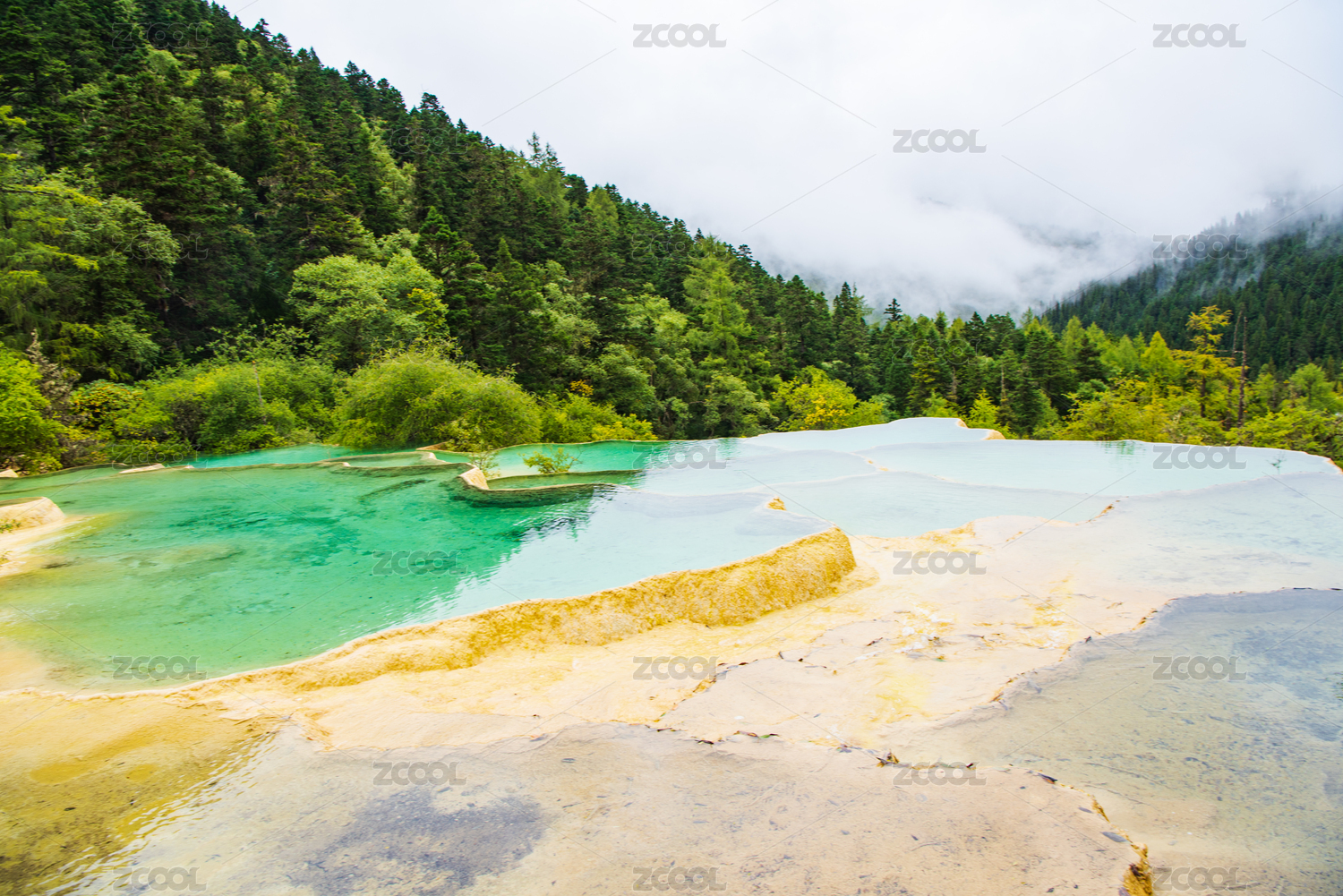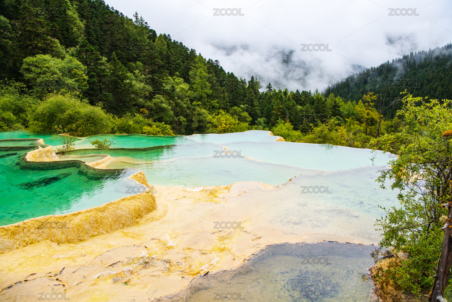 四川,黄龙,雨天,靛蓝,树木,瑶池,五彩池,彩池,水,地质