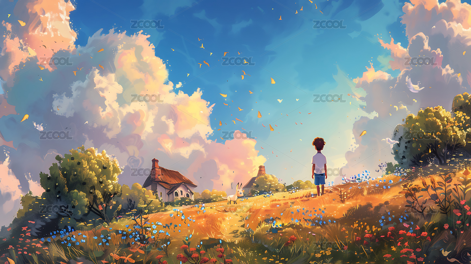 AIGCFG02,高山,山,天空,男孩,卡通,插画,人,风景,吉卜力