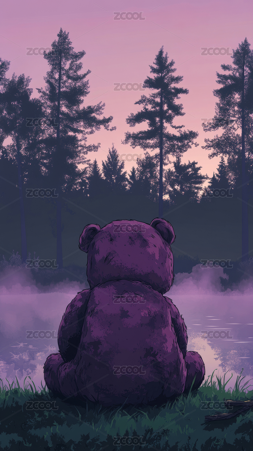 森林湖畔的紫色泰迪熊