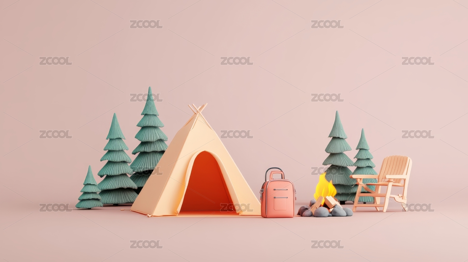 粉色背景下的露营场景
