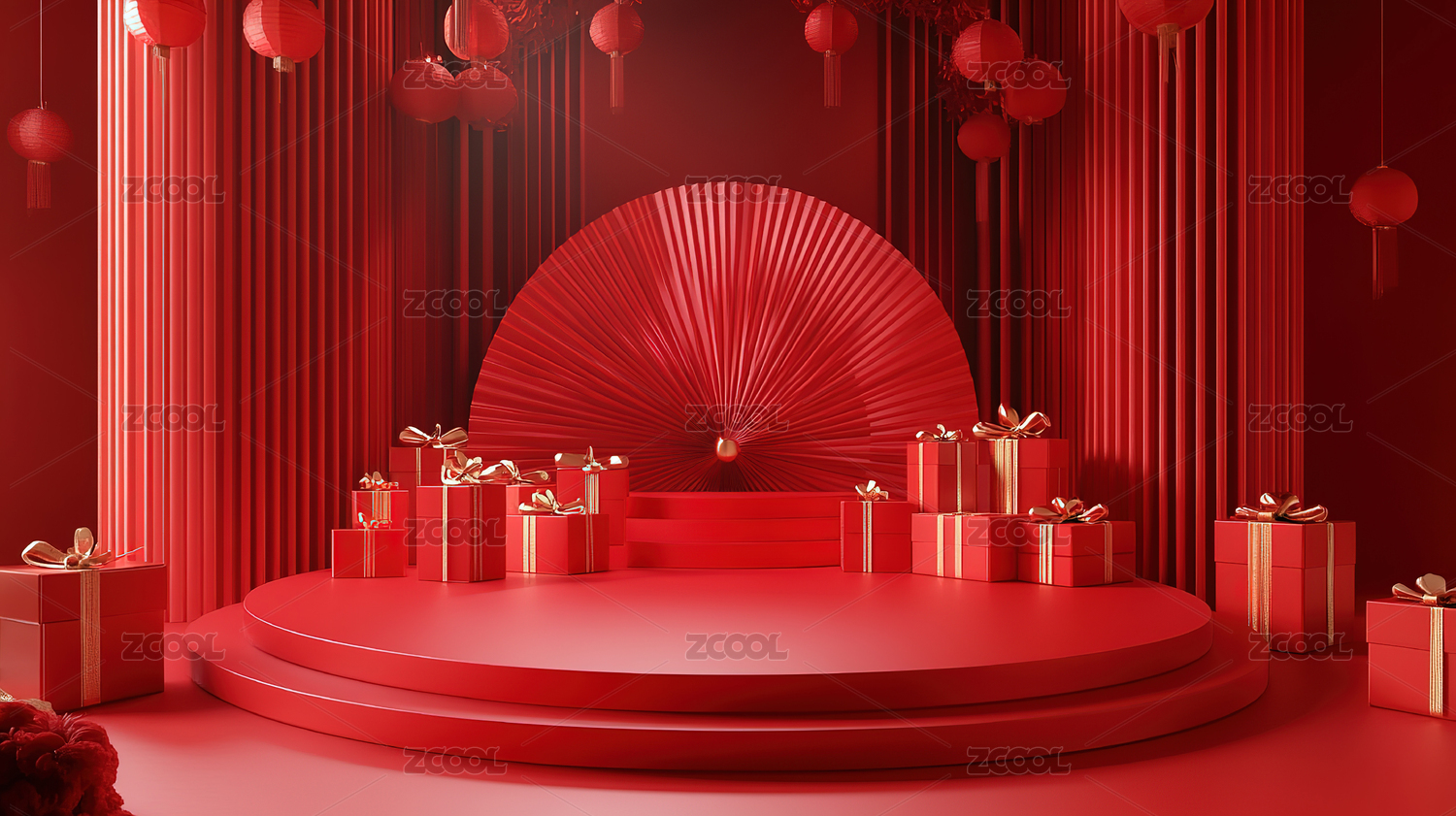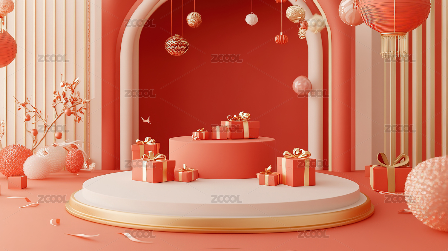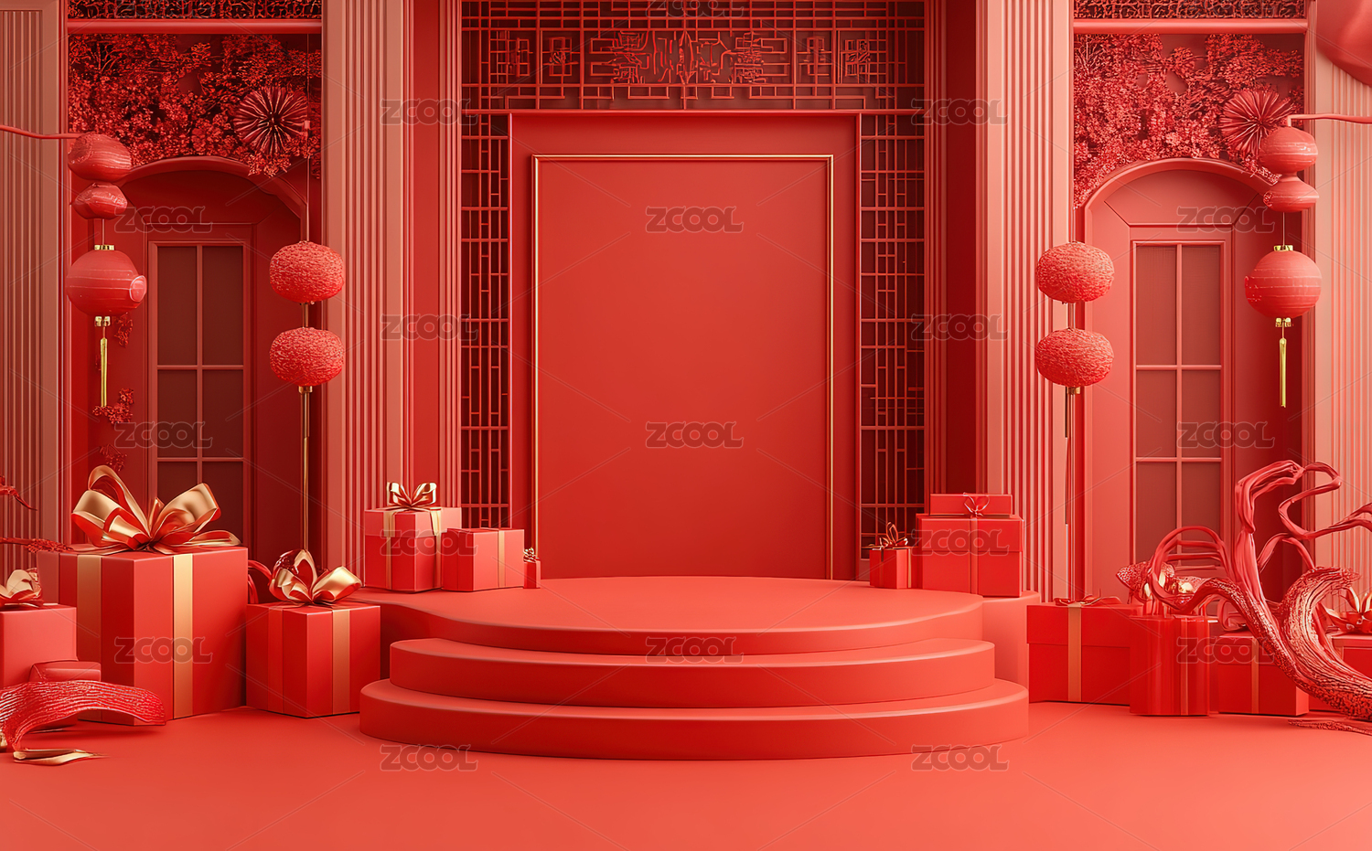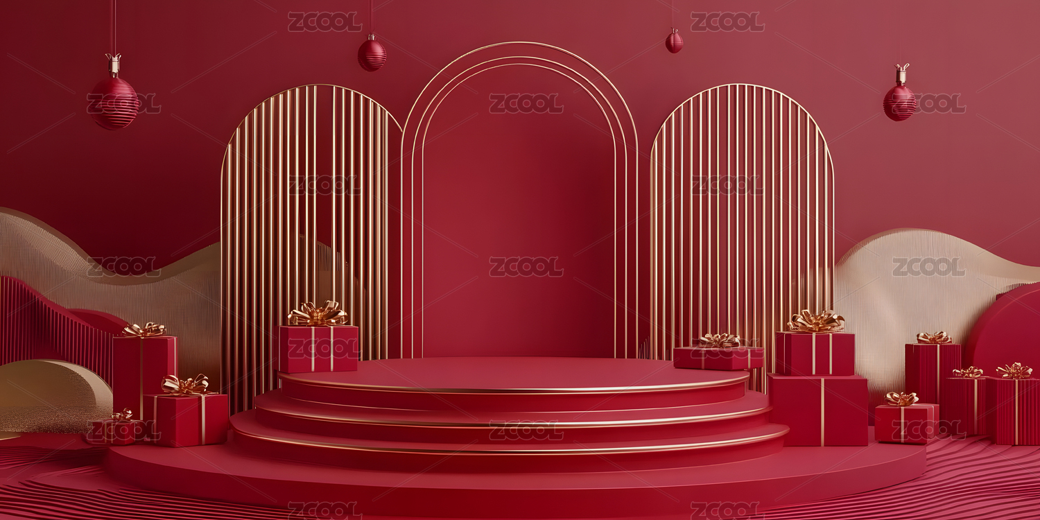 3D中式红色电商展台背景