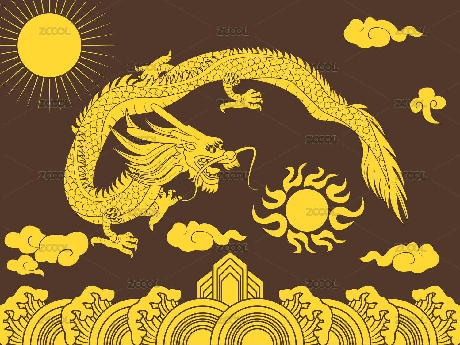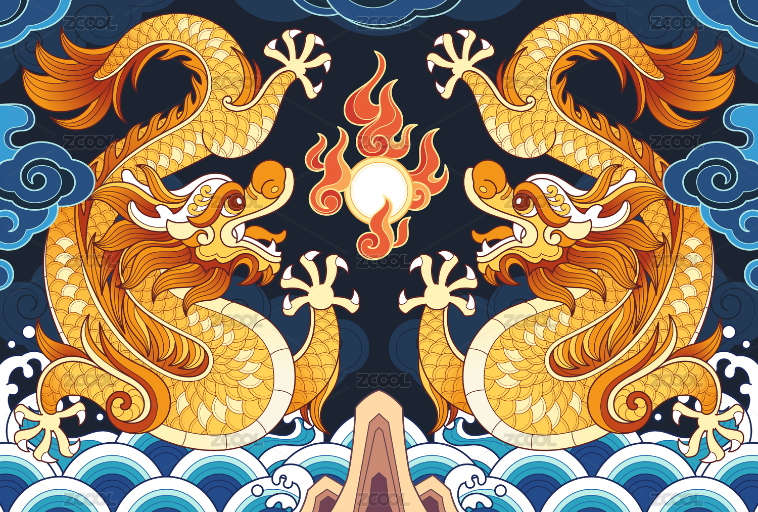 中国龙年金龙牡丹花祥云浪花铜钱纹样插画