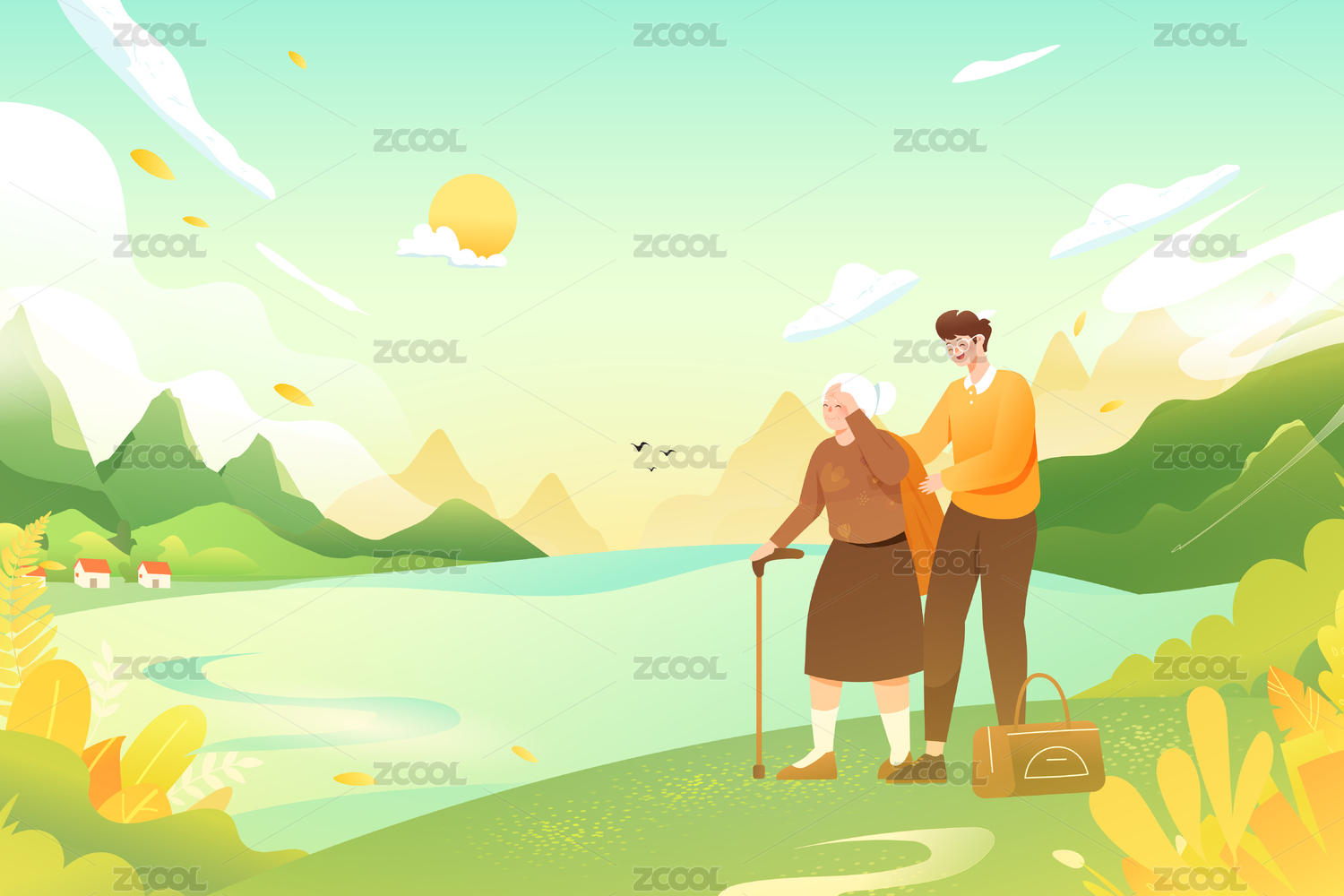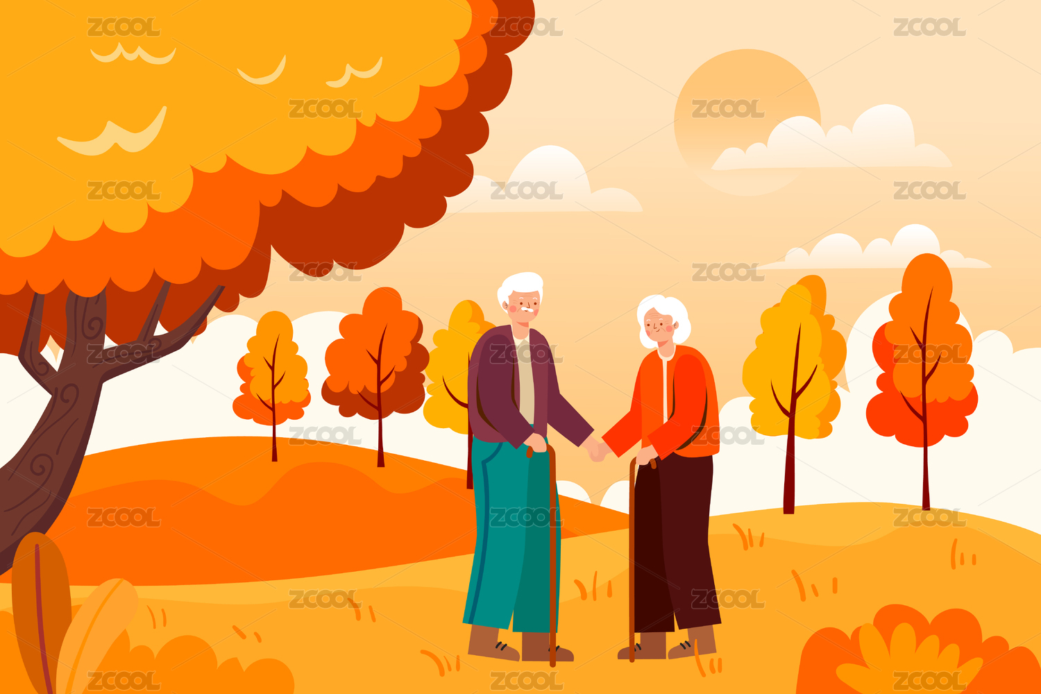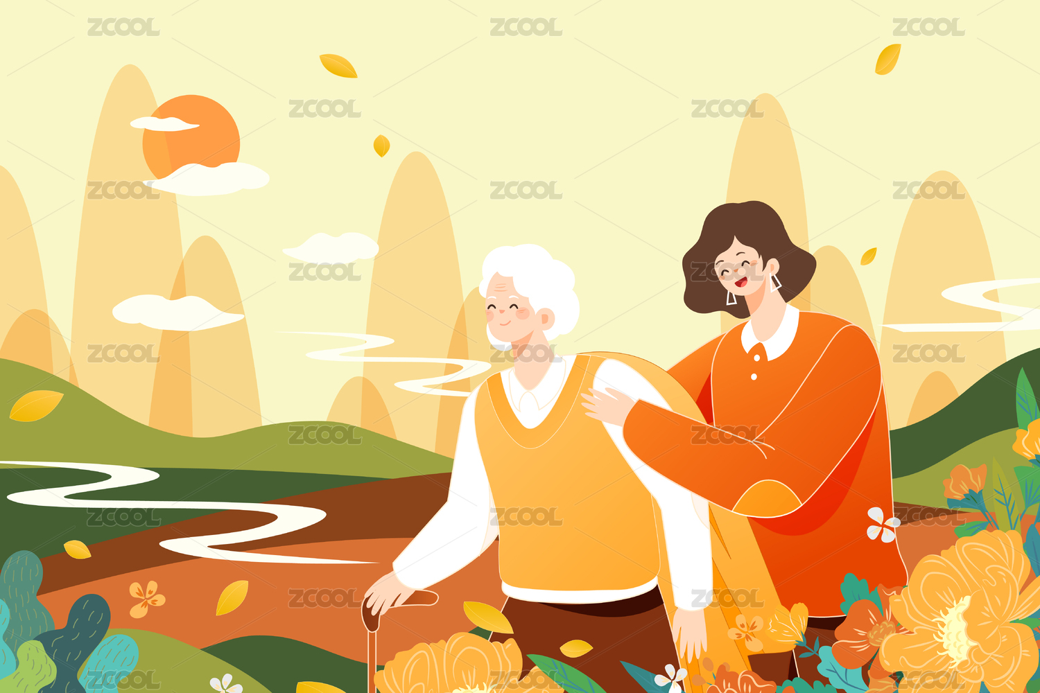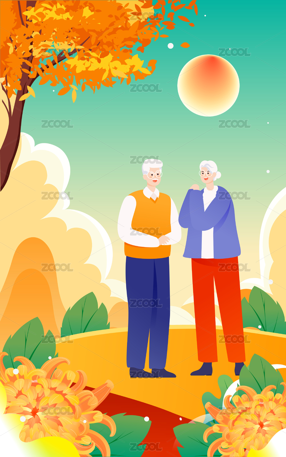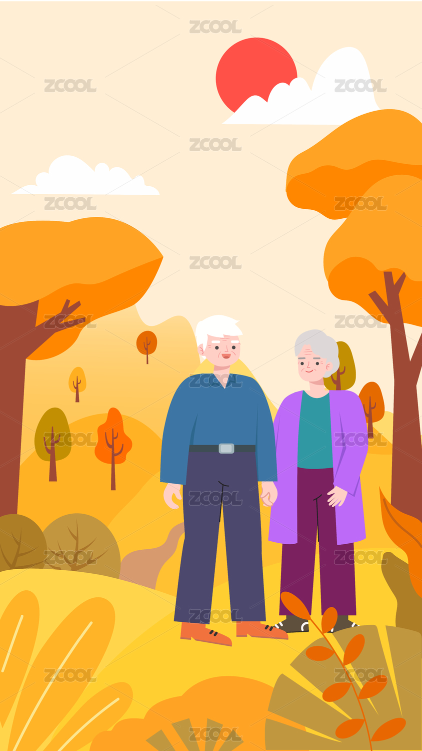 重阳节老年人登高望远爷爷奶奶秋游登山插画
