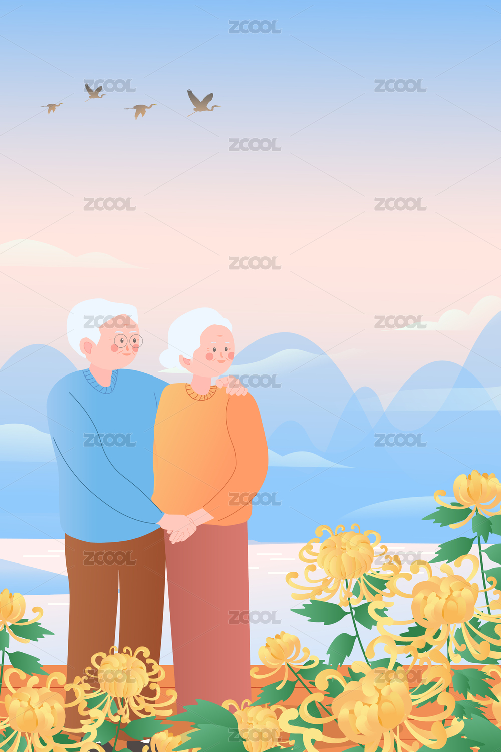 两位老人站在黄昏的菊花前的竖版矢量插画