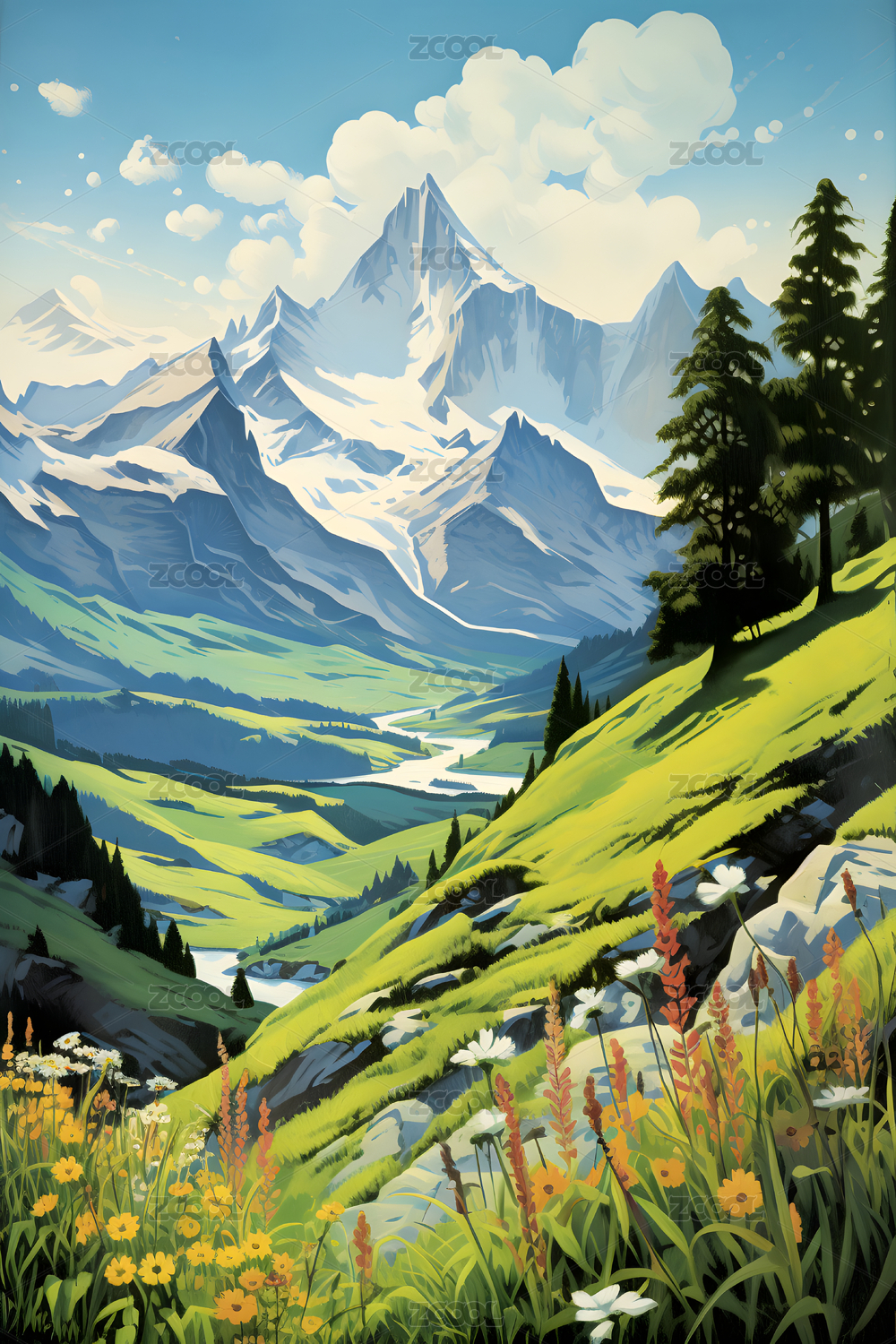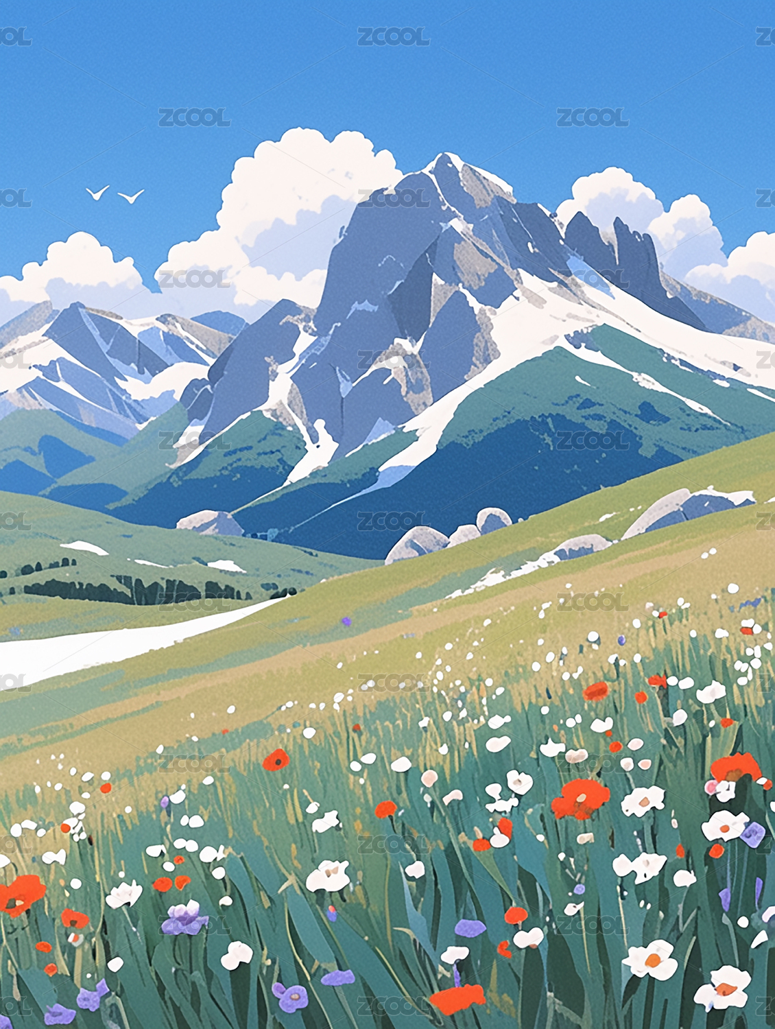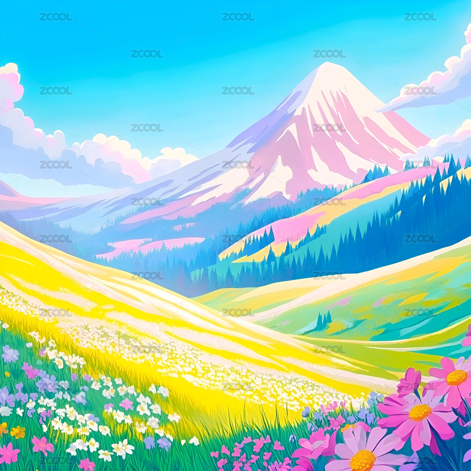 卡通,漫画,草地,野花,雪山,景色,自然,壁画,壁纸,树木