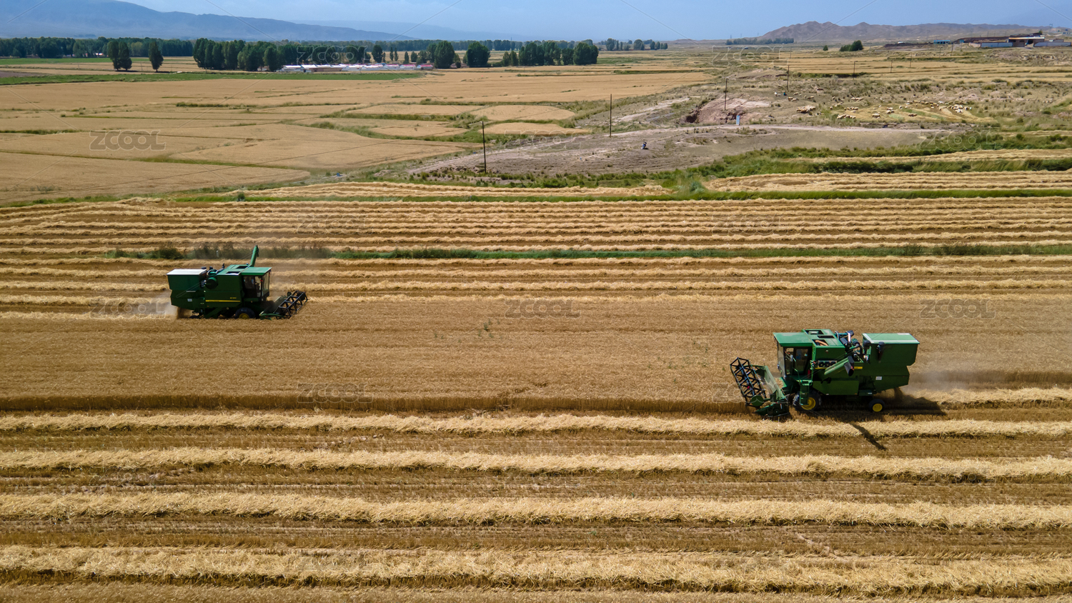 祁连山下河西走廊麦田农田丰收收割机