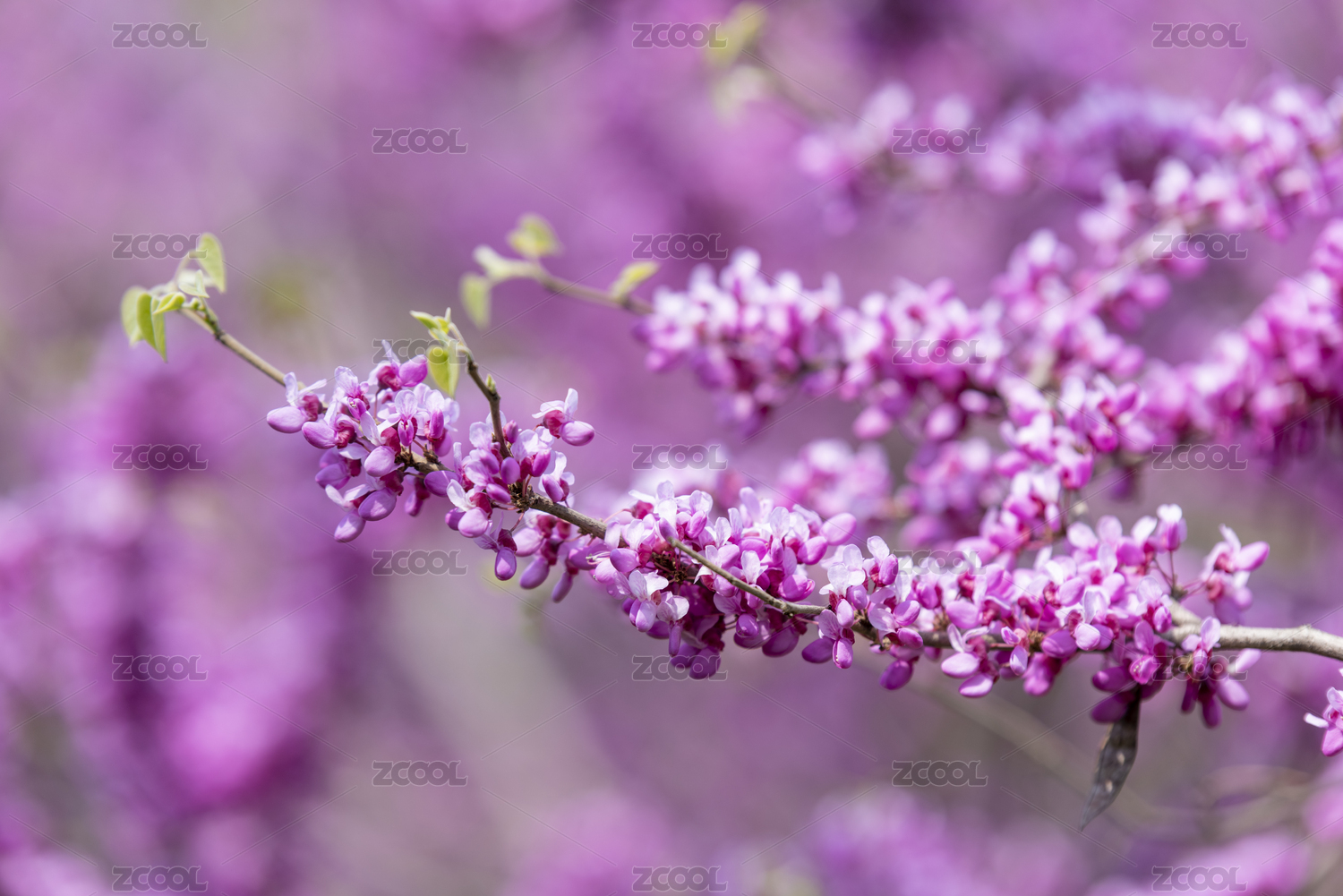 初春盛开的紫荆花挂满晶莹剔透的露珠特写