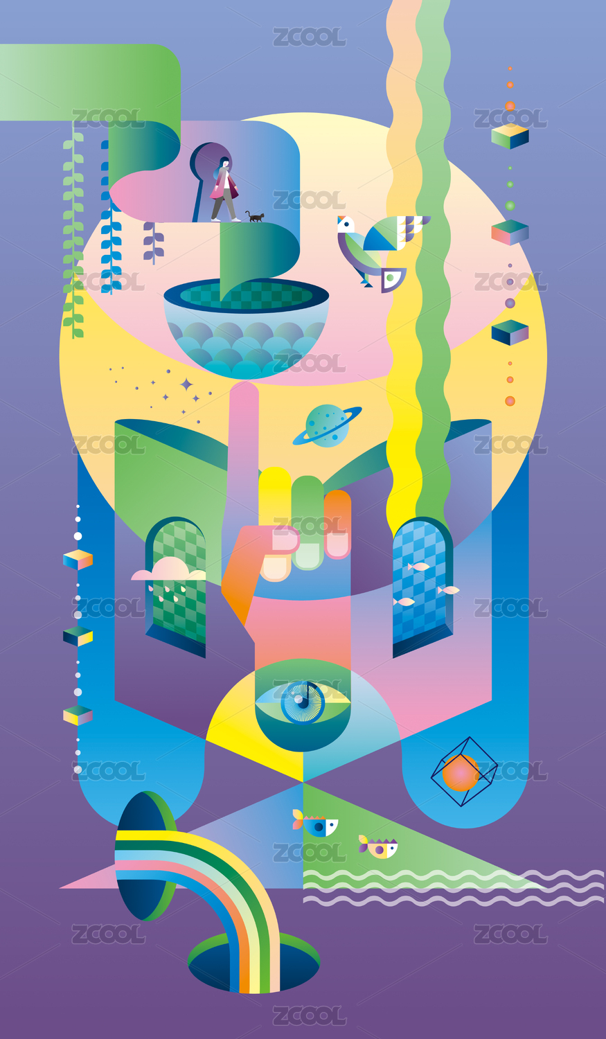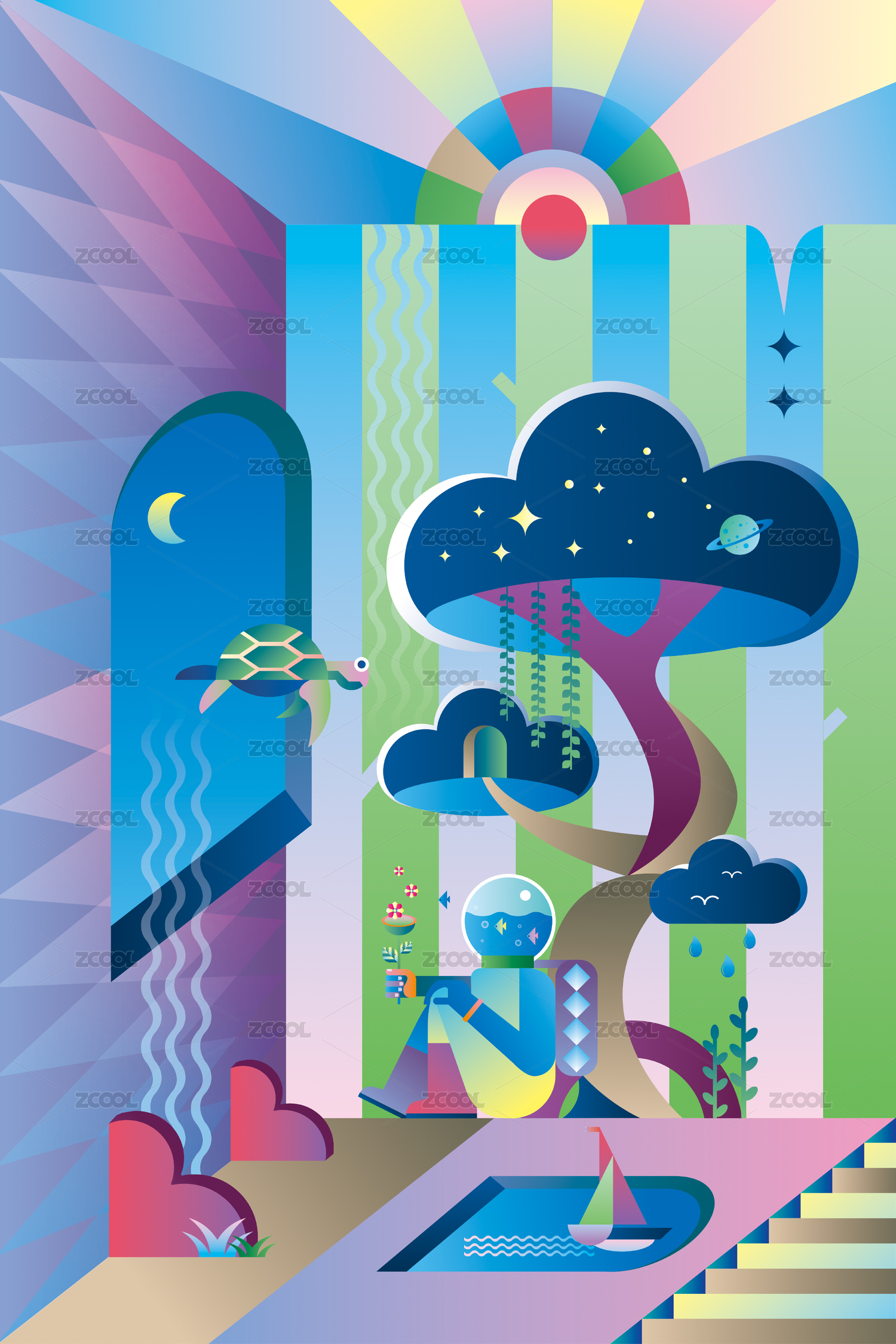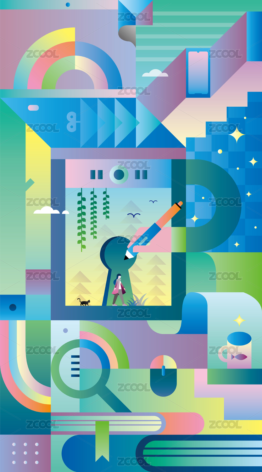 商务办公和绘画工具组成的奇幻插画