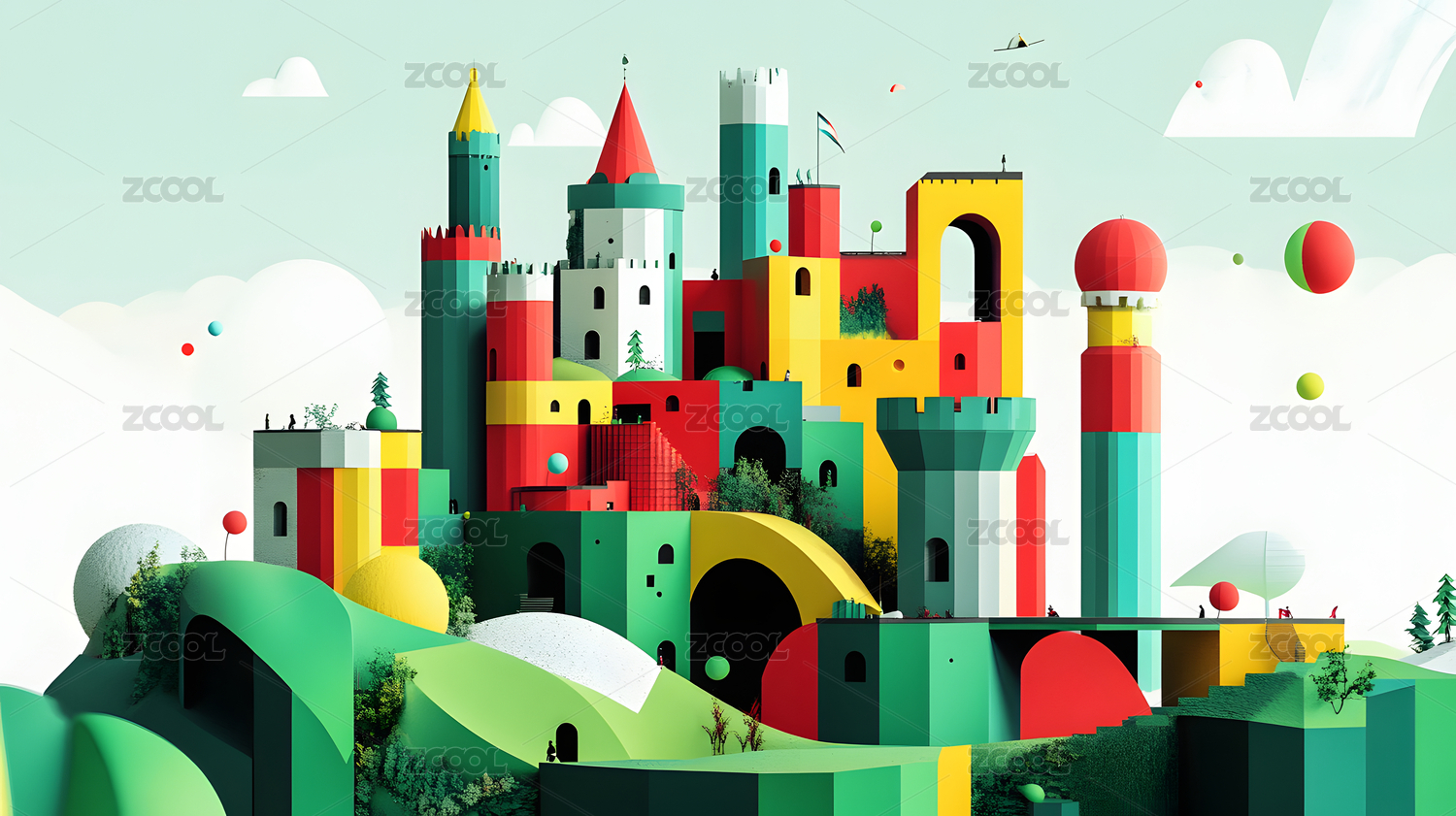 插画,人,户外,幸福,女人,自然,天空,建筑,城堡,童话