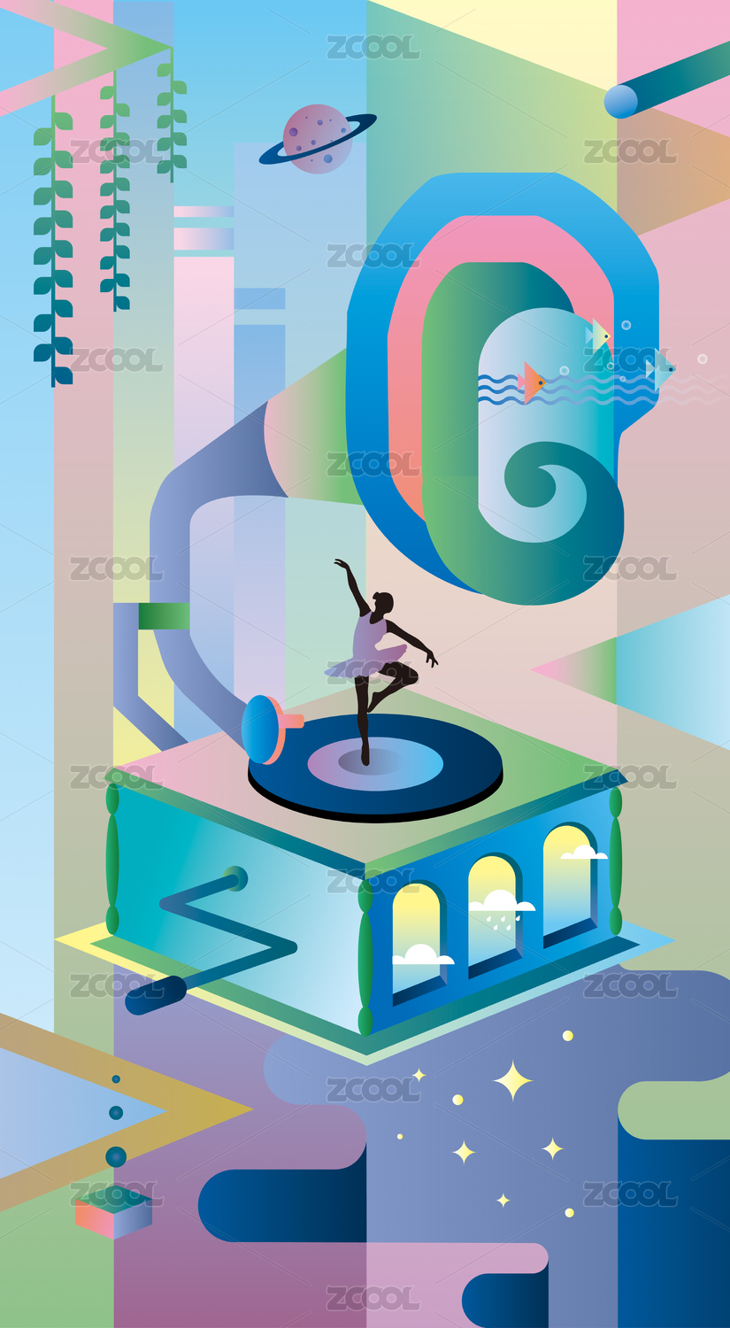星河中在留声机上起舞的女孩插画壁纸