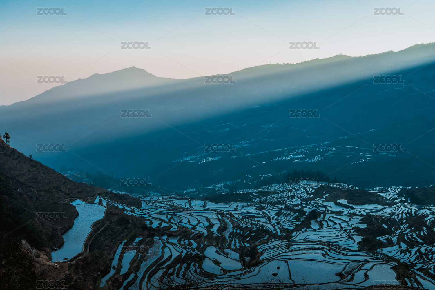 中国云南红河日出下的水梯田