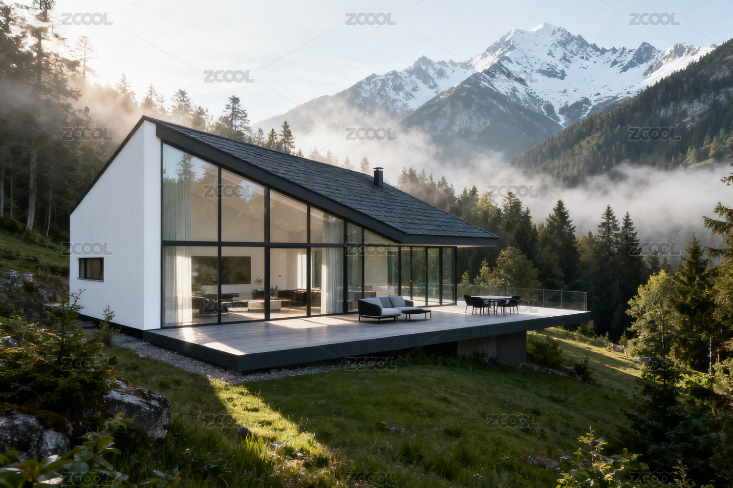 雪山森林中的现代白色建筑