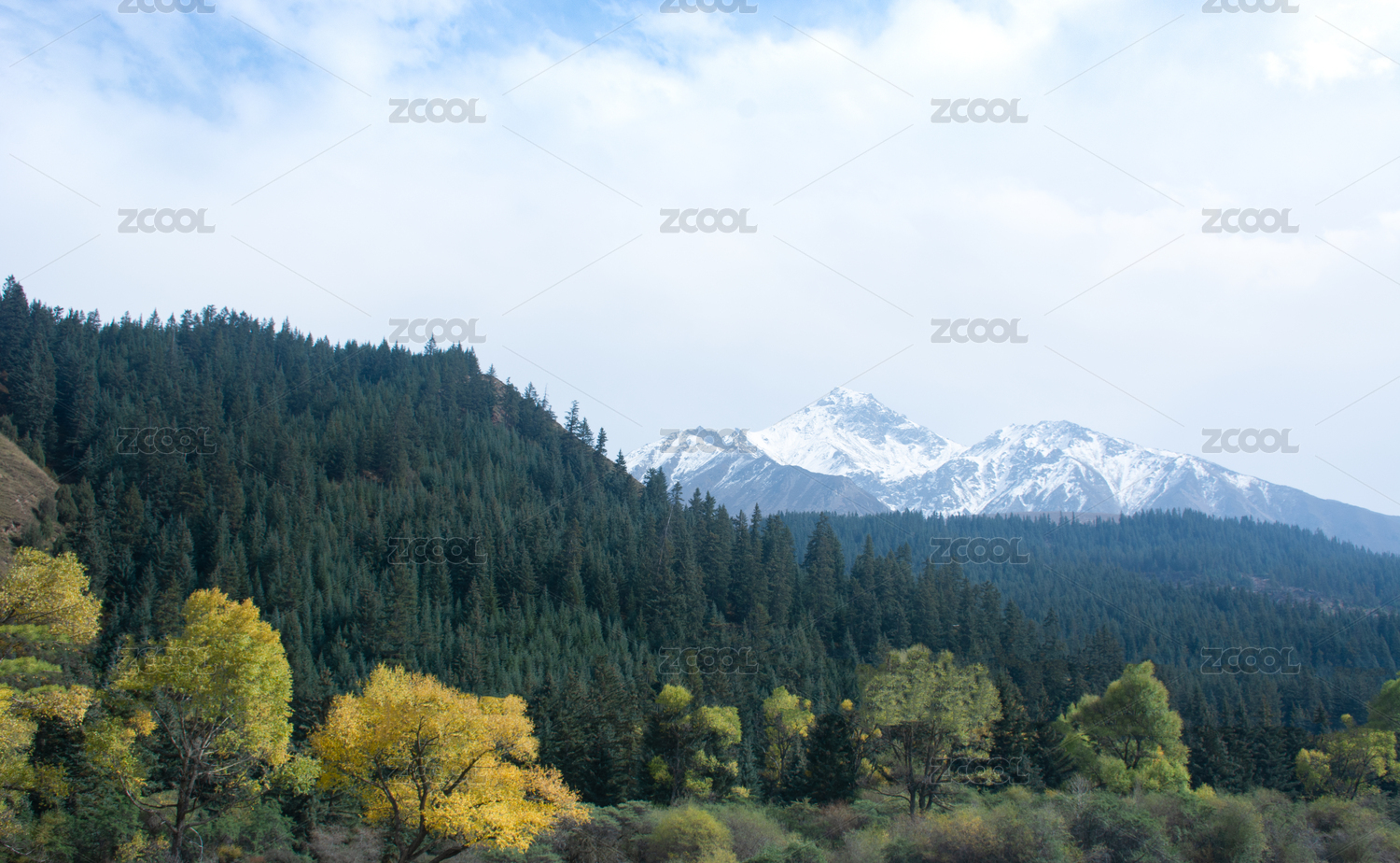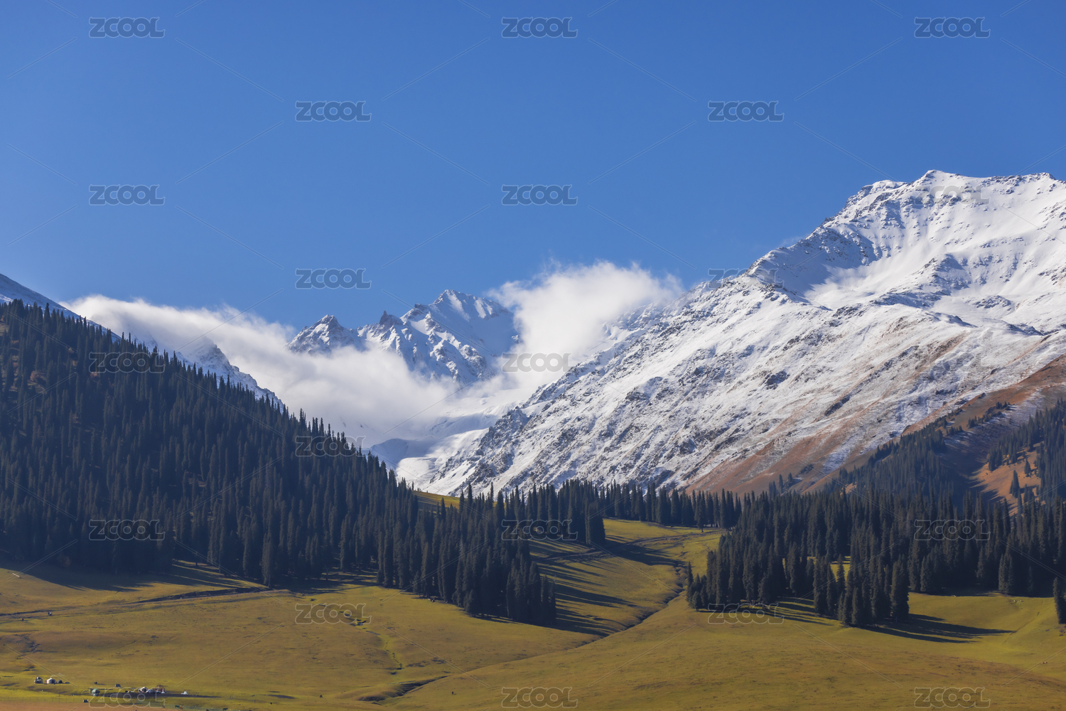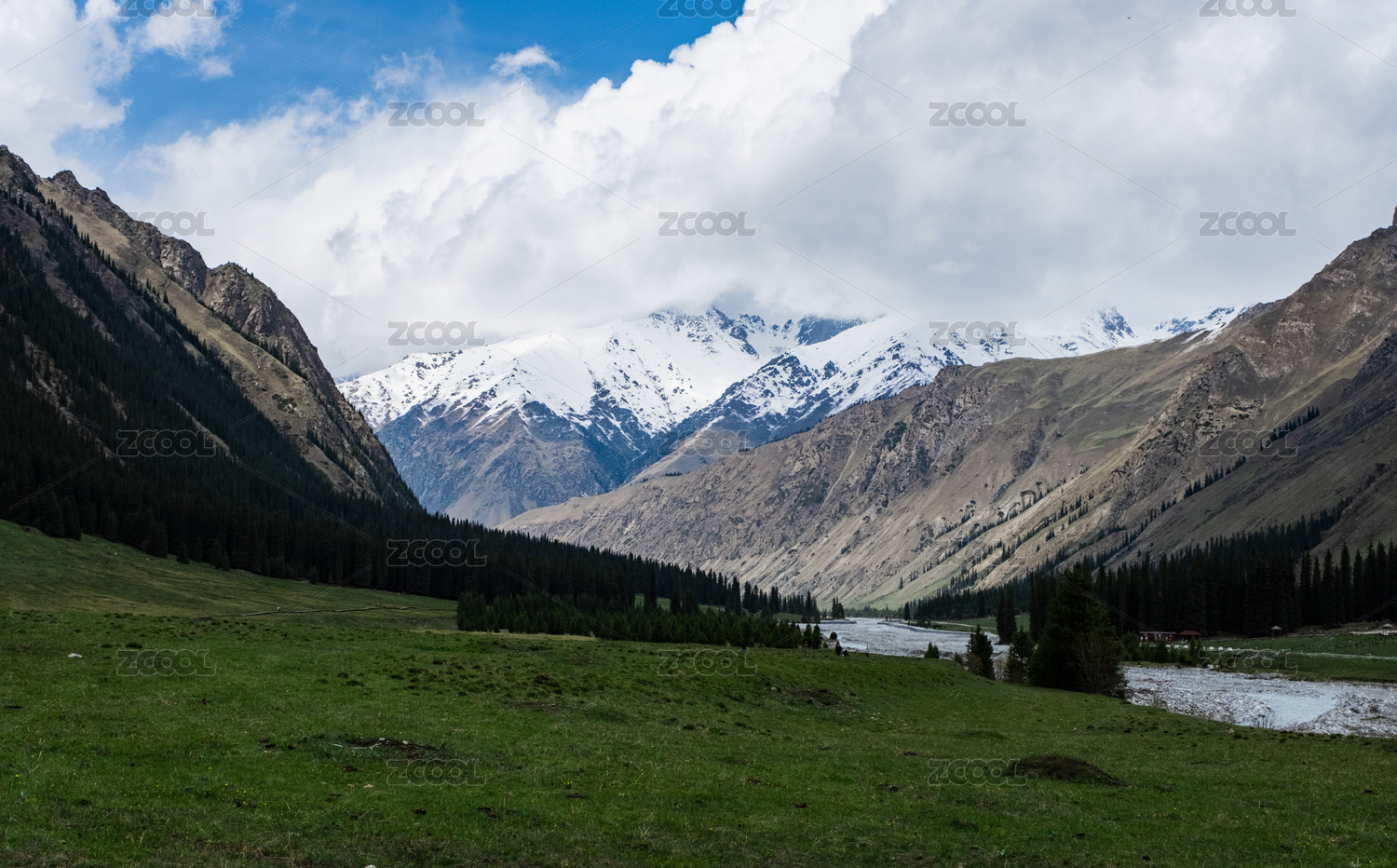 中国新疆伊犁蓝天白云下的雪山草原森林小溪