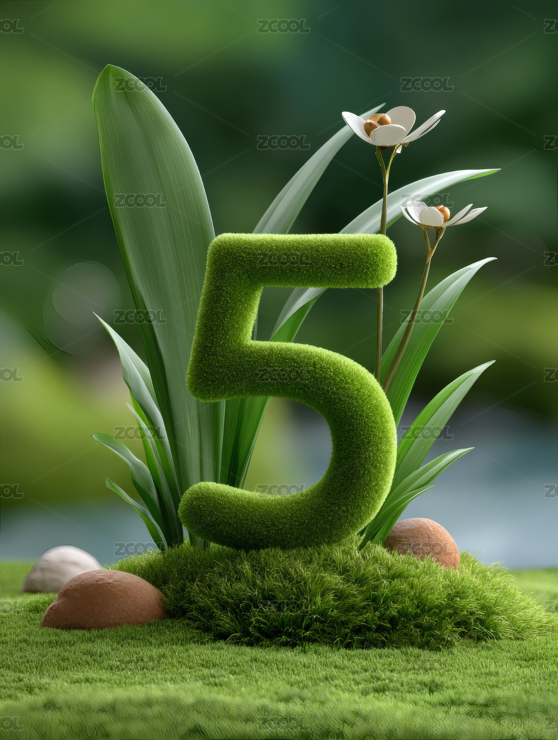 毛绒数字五在草地上的卡通场景