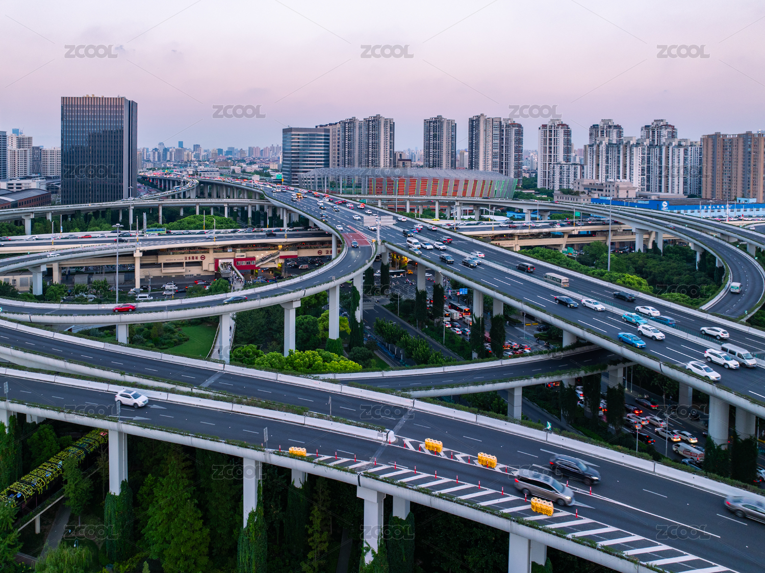 航拍上海汶水路立交桥城市晚高峰车来车往