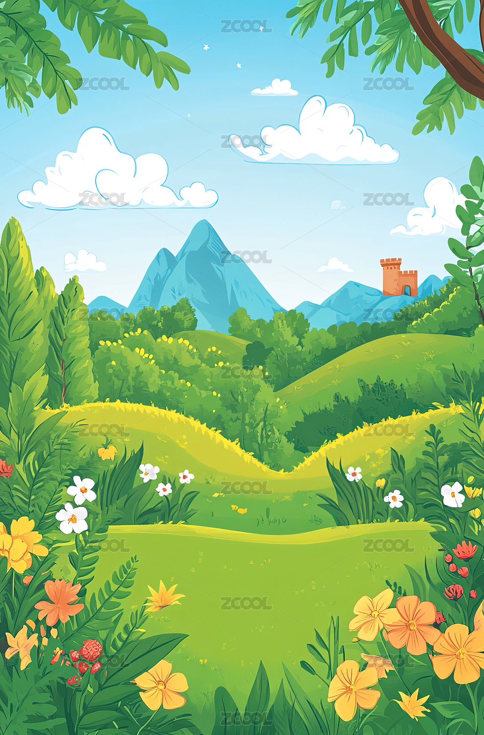 风景,户外,云,插画,花,草地