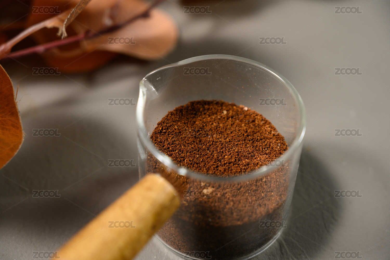 桌面上的杯子里的干爽细腻的咖啡粉