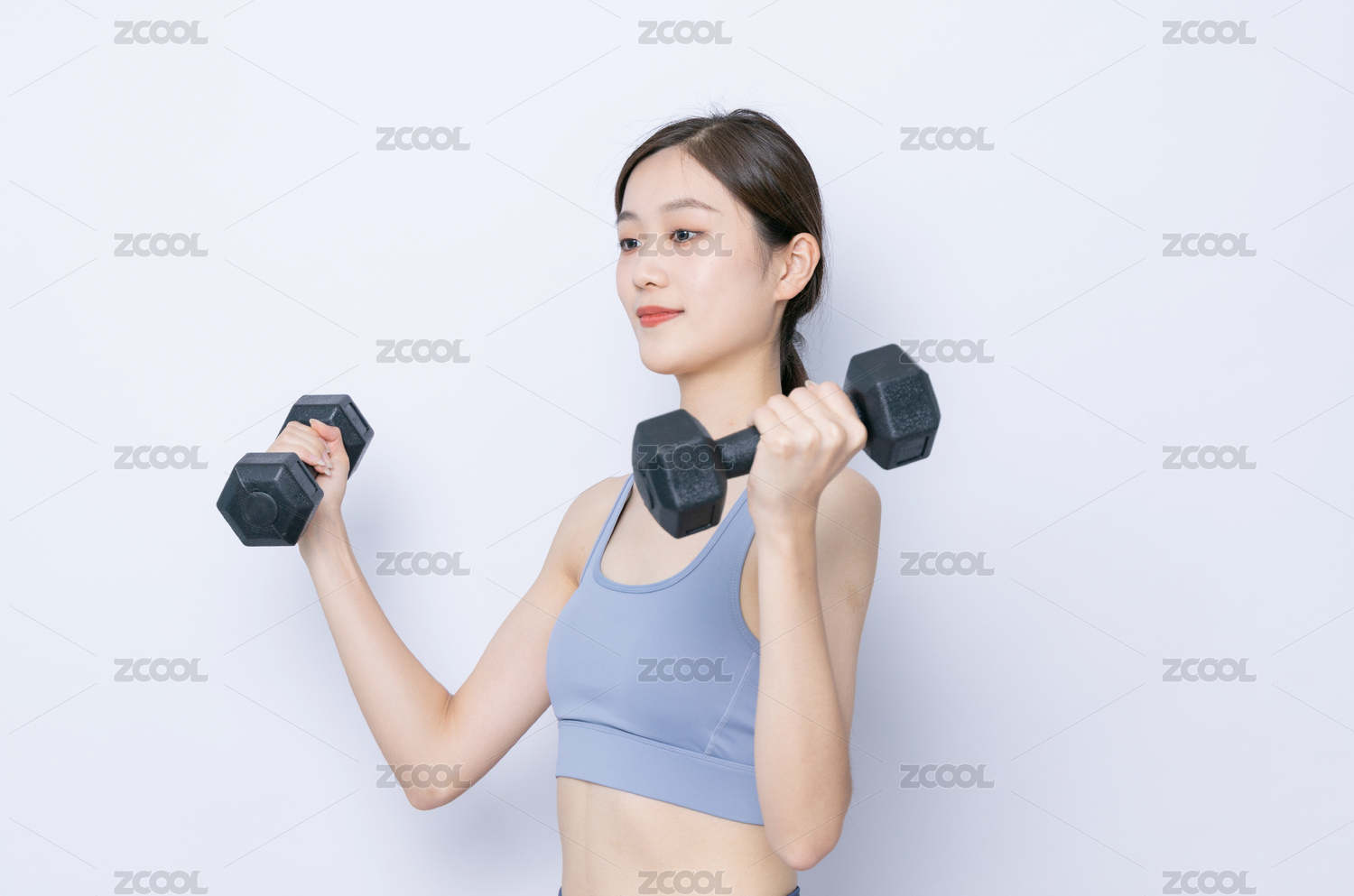 身穿运动内衣,手持哑铃锻炼的年轻女性