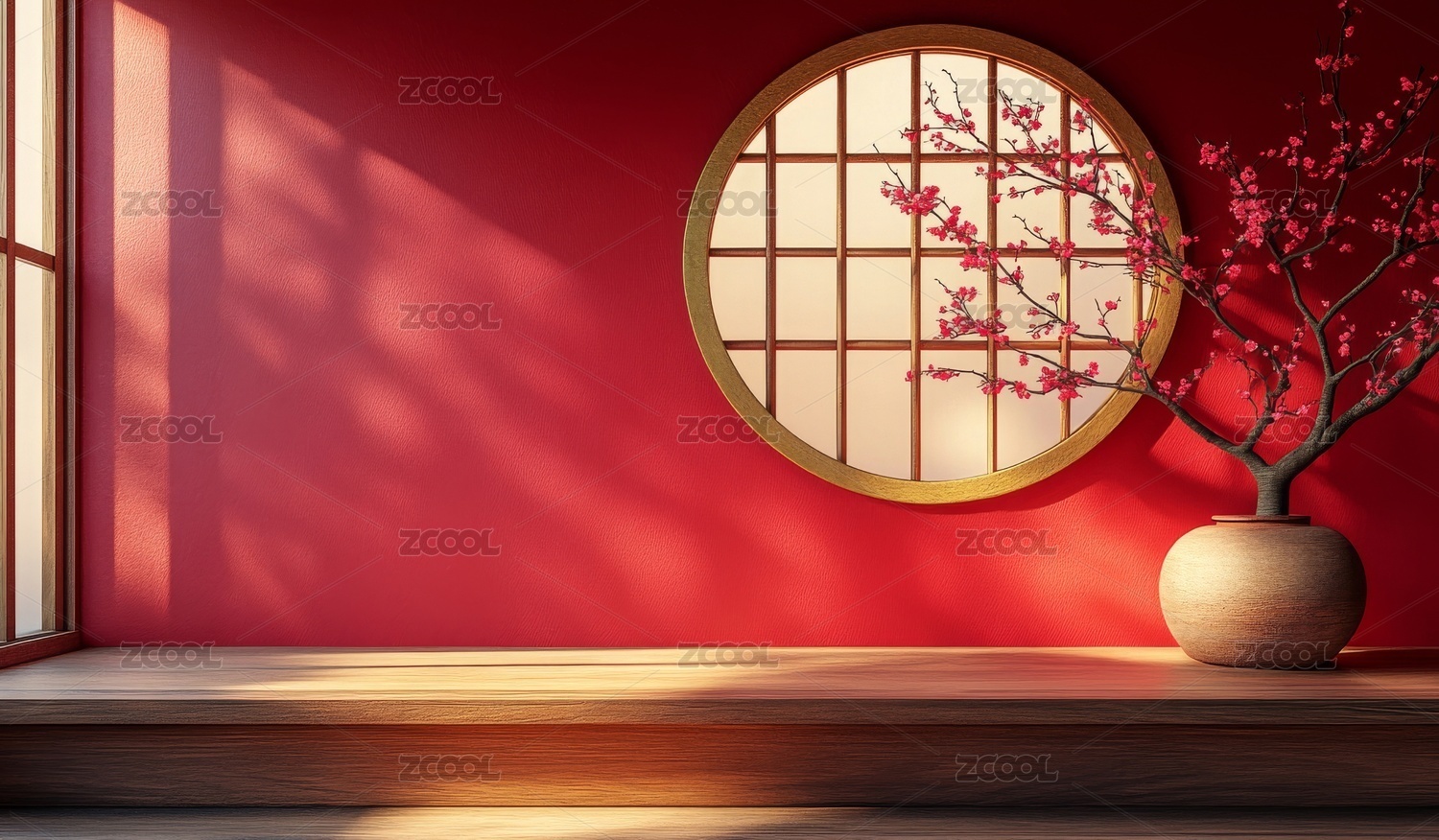 中式极简风格插花和红色背景墙