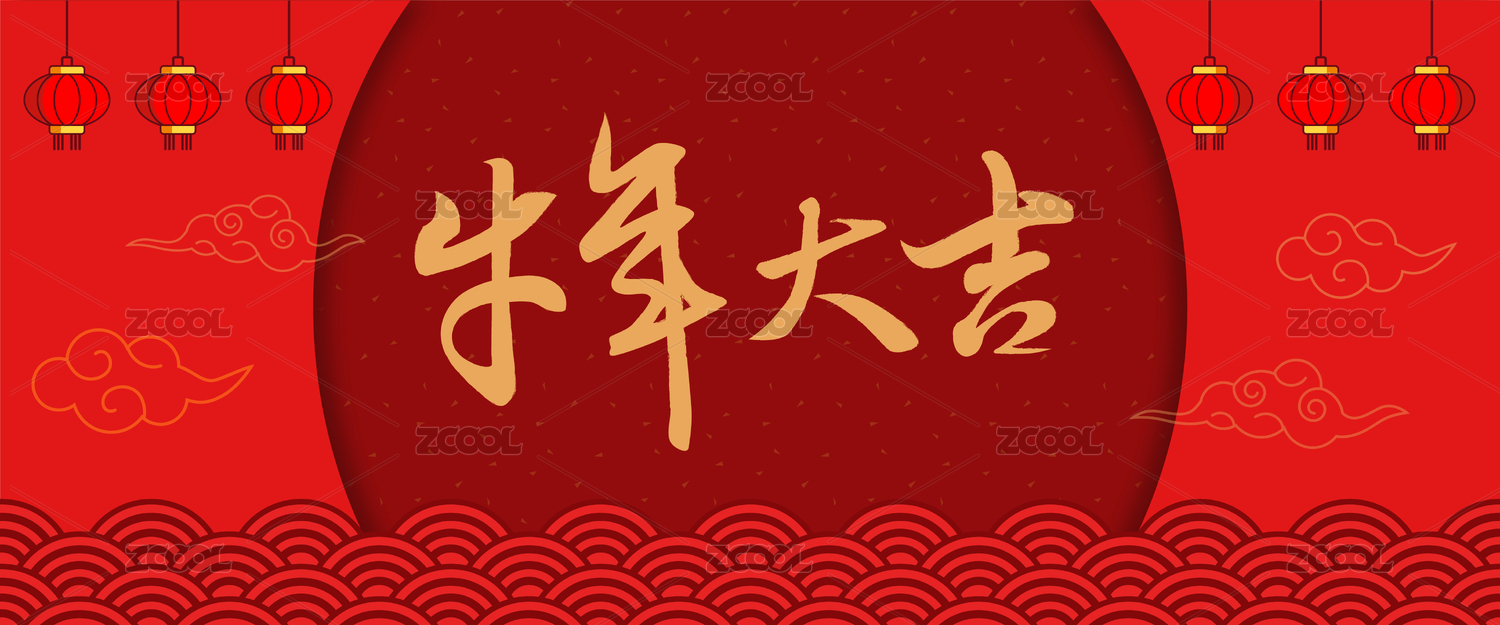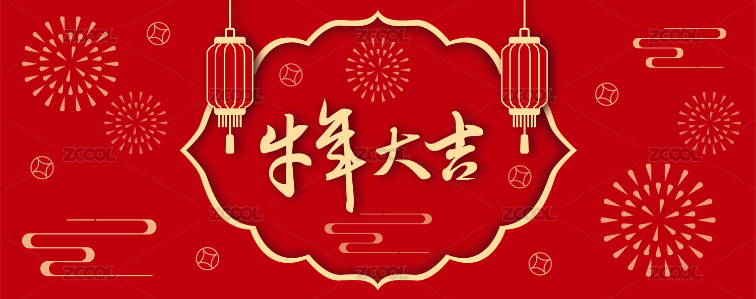 带有灯笼烟花云纹图案的红底春节牛年书海报