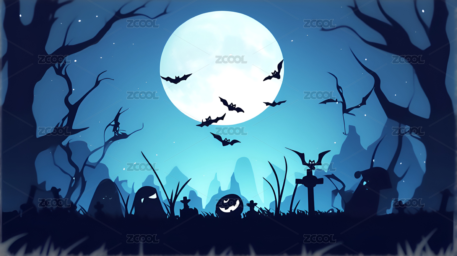 万圣节之夜南瓜灯月亮蝙蝠蓝色背景设计图