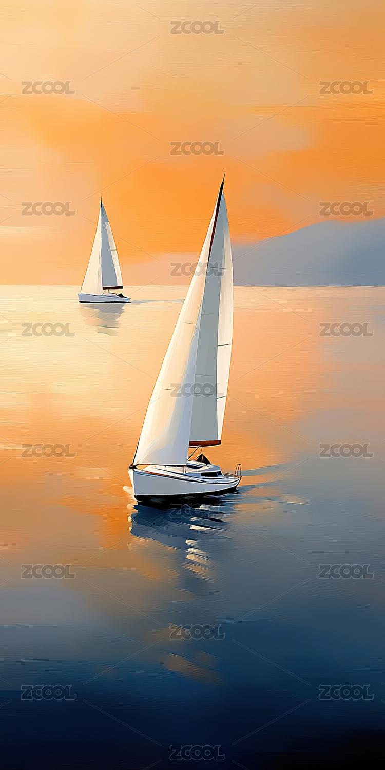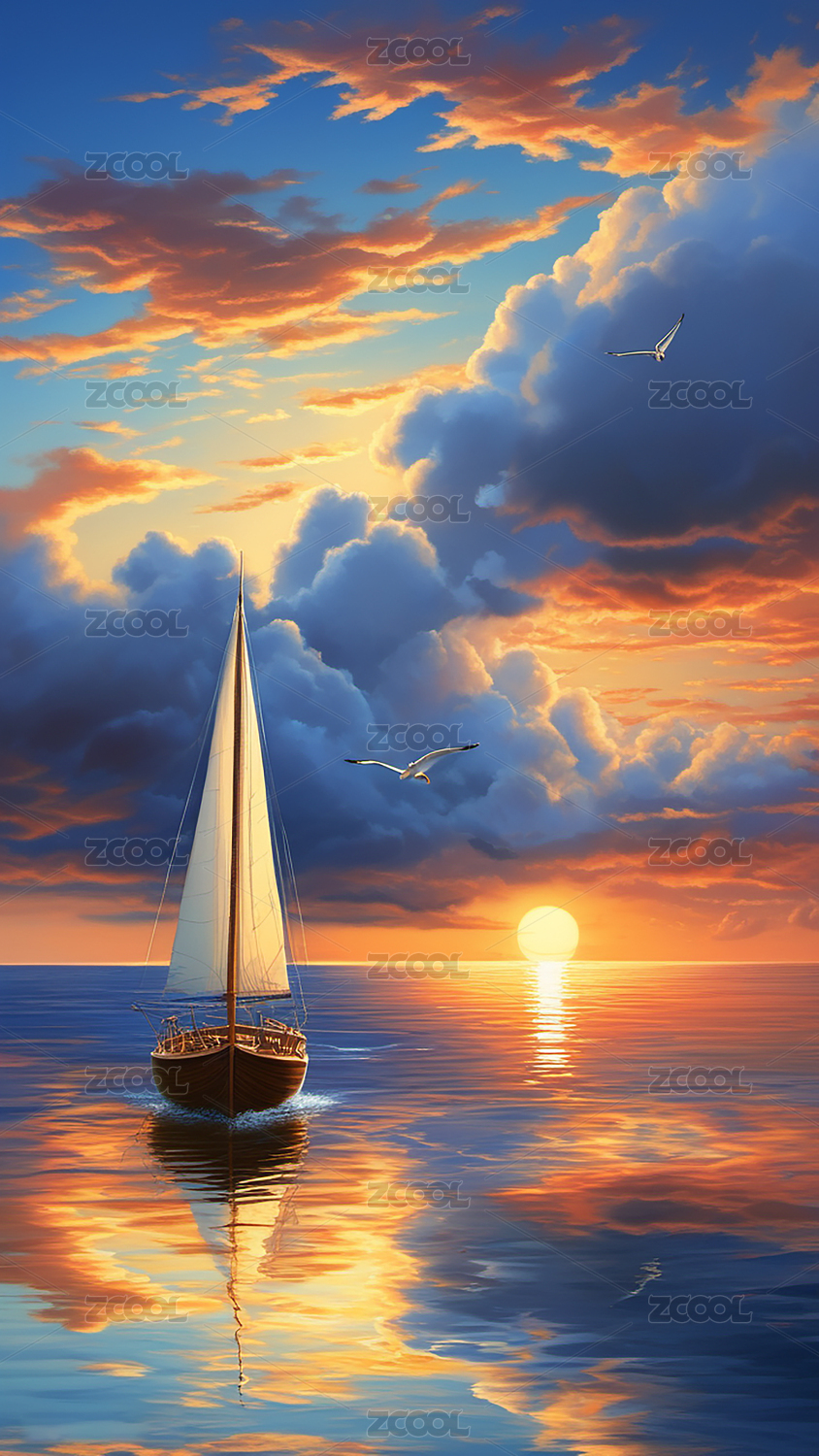 动漫风海洋中唯美夕阳下的云彩和帆船